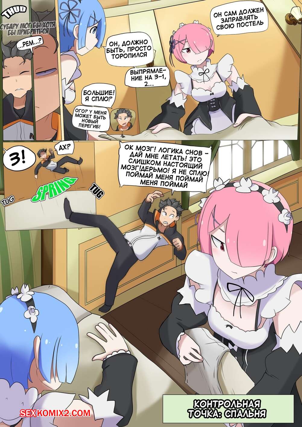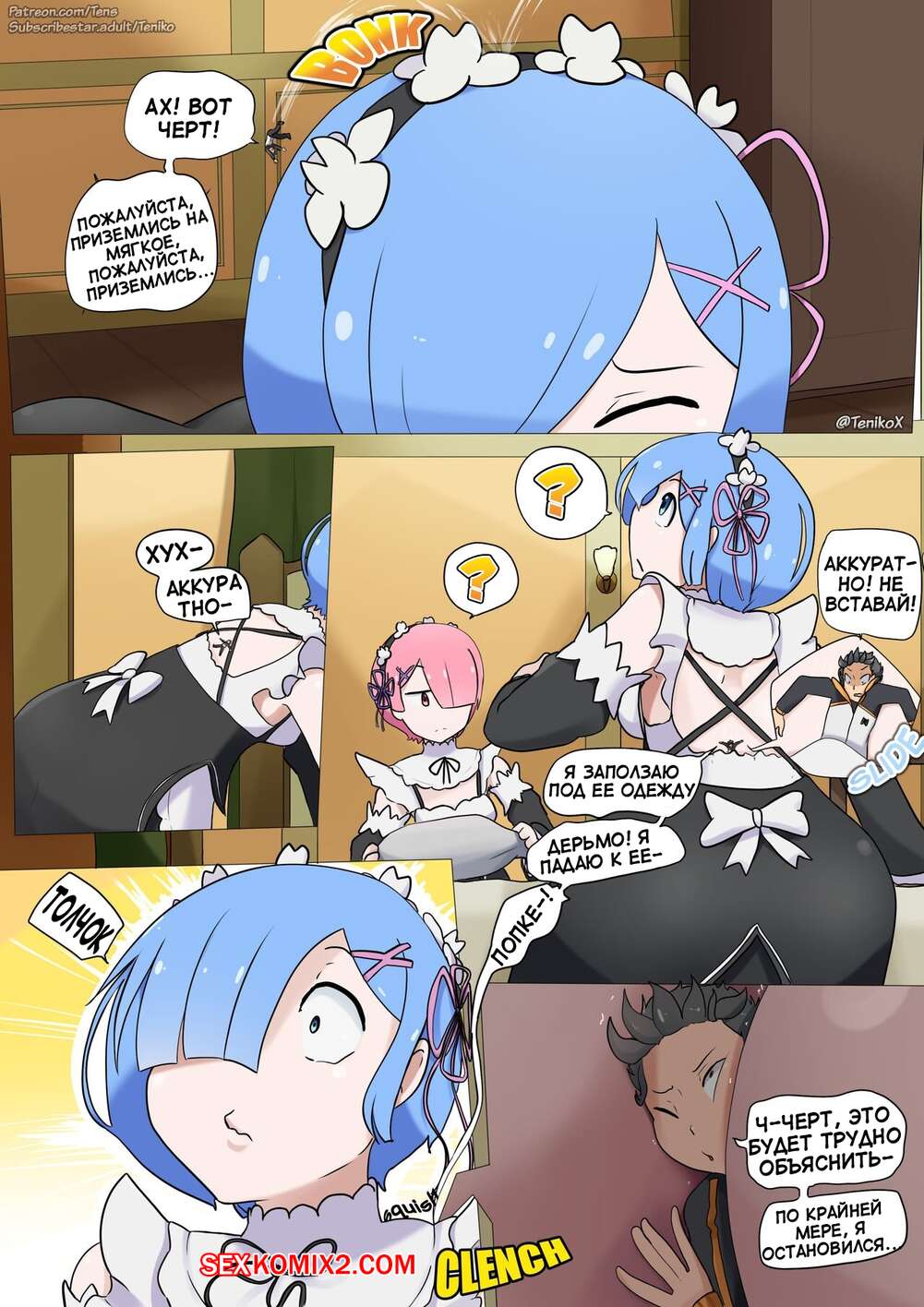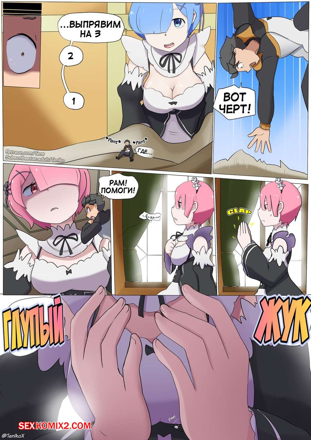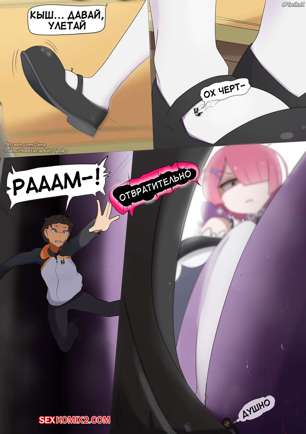 Порно комикс Субару уменьшился. Парень уменьшился и попал в декольте своей горничной. Пока его искала по всему дому он наслаждался ее теплыми сиськами.