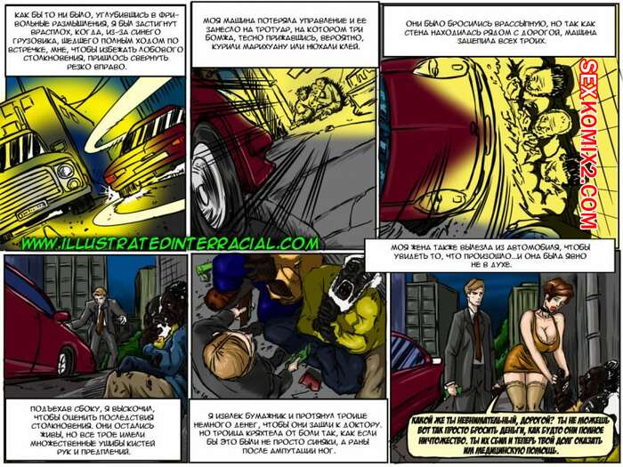 Порно комикс Голодранцы Сисястая милфа брюнетка уговорила своего мужа взять к ним домой бездомных черных парней. Оставшись с ними наедине сучка стала сосать их большие хуи, после чего дала им себя выебать.