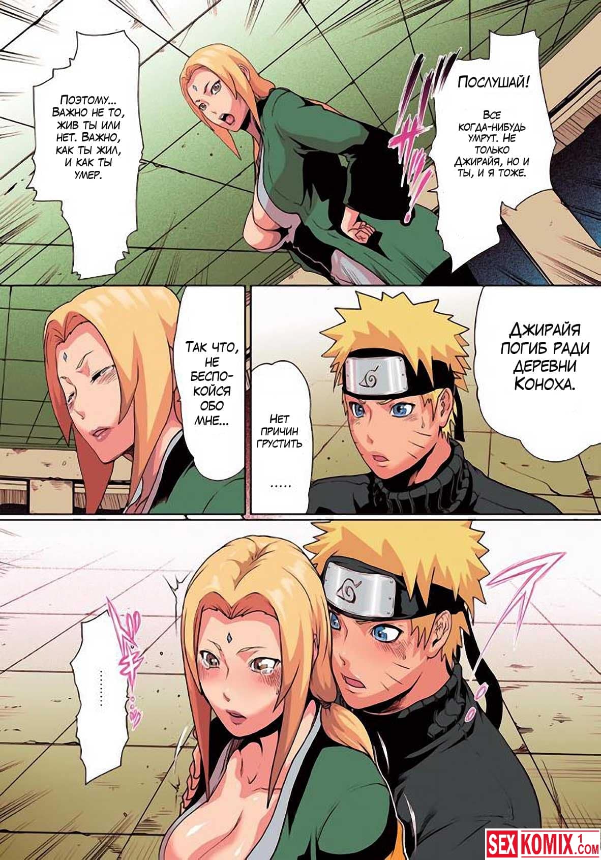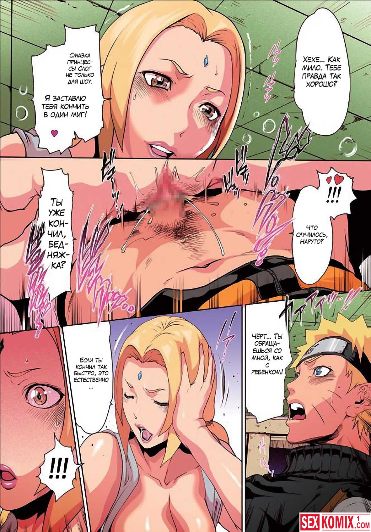 Порно комикс Любовь Наруто. Часть 5. Наруто был на тренировке к нему пришла Тсунаде, она была расстроена недавним сексом со своим знакомым. Женщина выговорилась Наруто об этом и парень решил поддержать её и предложил секс. Во время секса он создал четыре своих клона и они тоже помогли трахнуть Тсунаде.