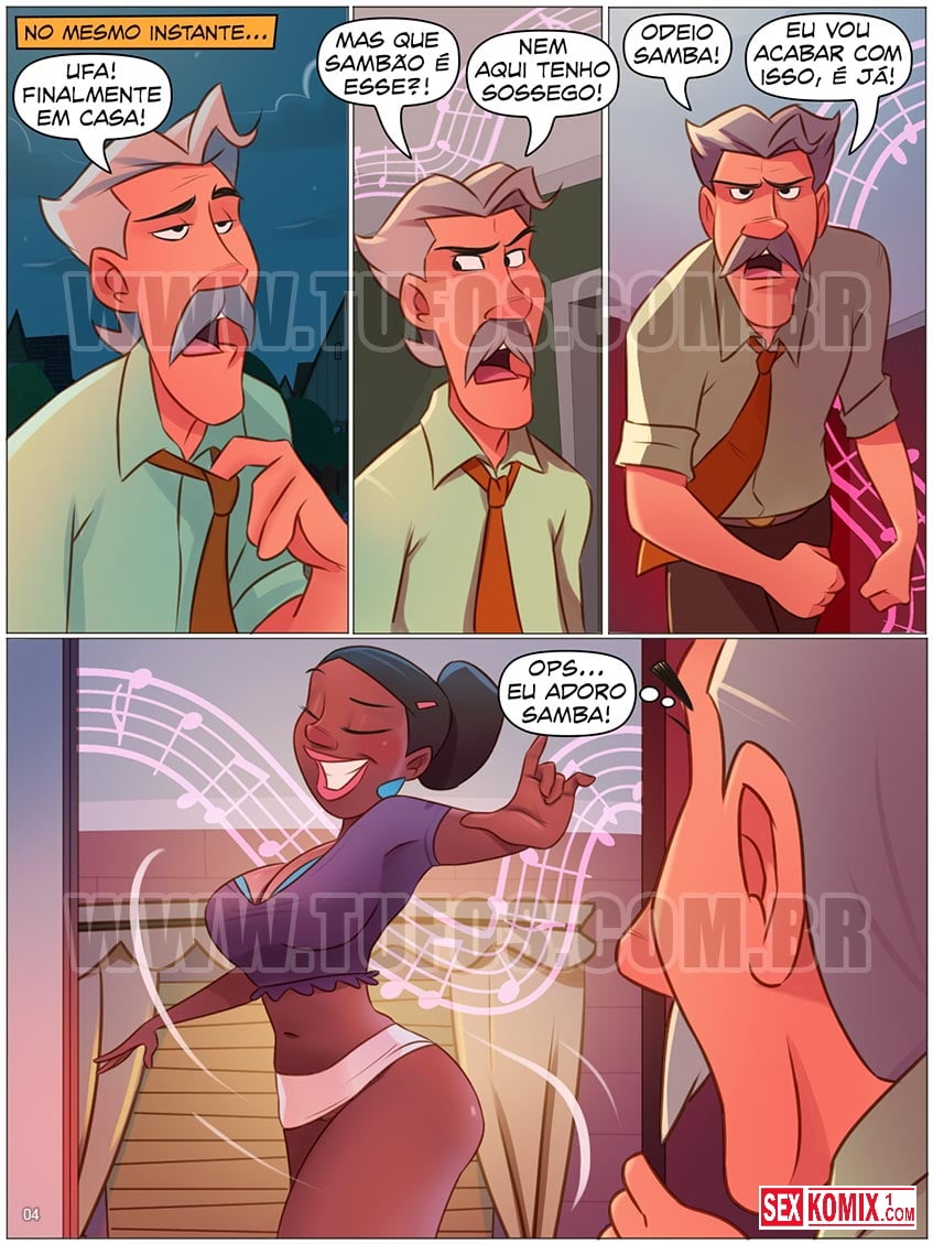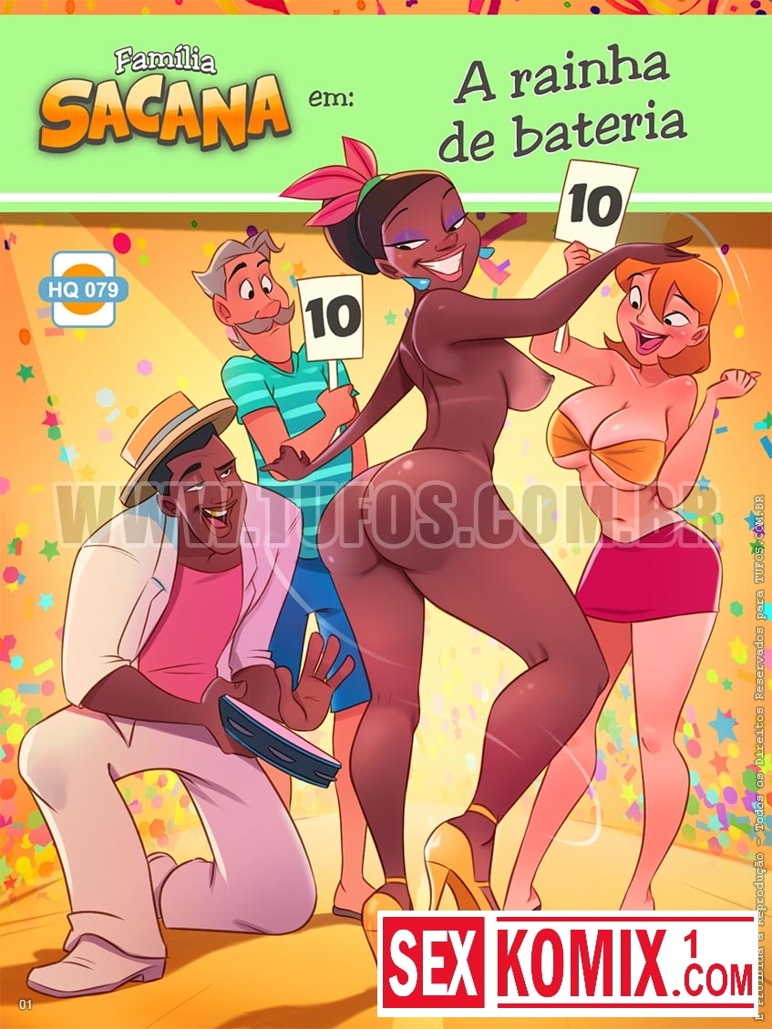 Порно комикс Похотливая семейка. Часть 79. Королева барабанов. Португальский. Чернокожая горничная убираясь в доме семейки Развратос решила порепетировать танец для фестиваля и одела мини юбку хозяйки. Это увидел хозяин, его член встал он сексуально танца его горничной. Мужчина наклонил её на кровать и вставил свой член в черную киску, тем более трусиков на ней уже не было.