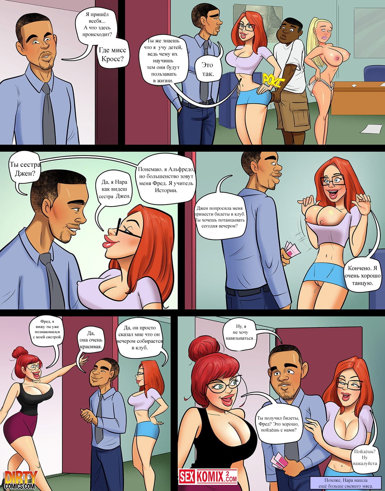 Порно комикс Мисс Кросс. Часть 5. Чернокожий парень застал свою учительницу с девушкой, они занимались лесбийским сексом. Но женщина не растерялась и пригласили парня поучаствовать в горячем сексе. Он достал свой большой член и трахнул обеих.