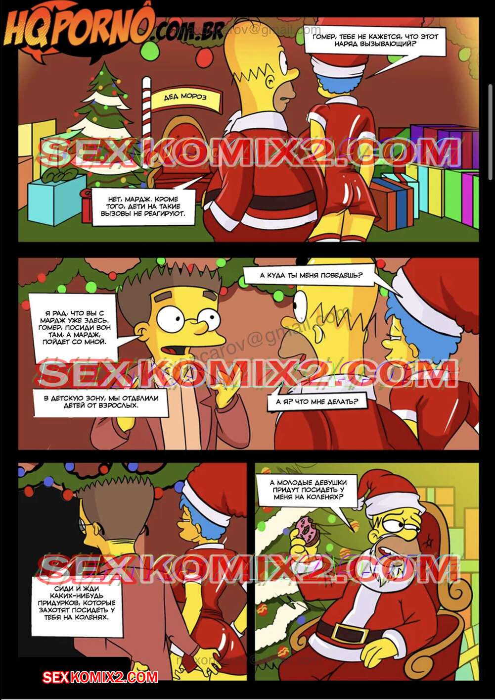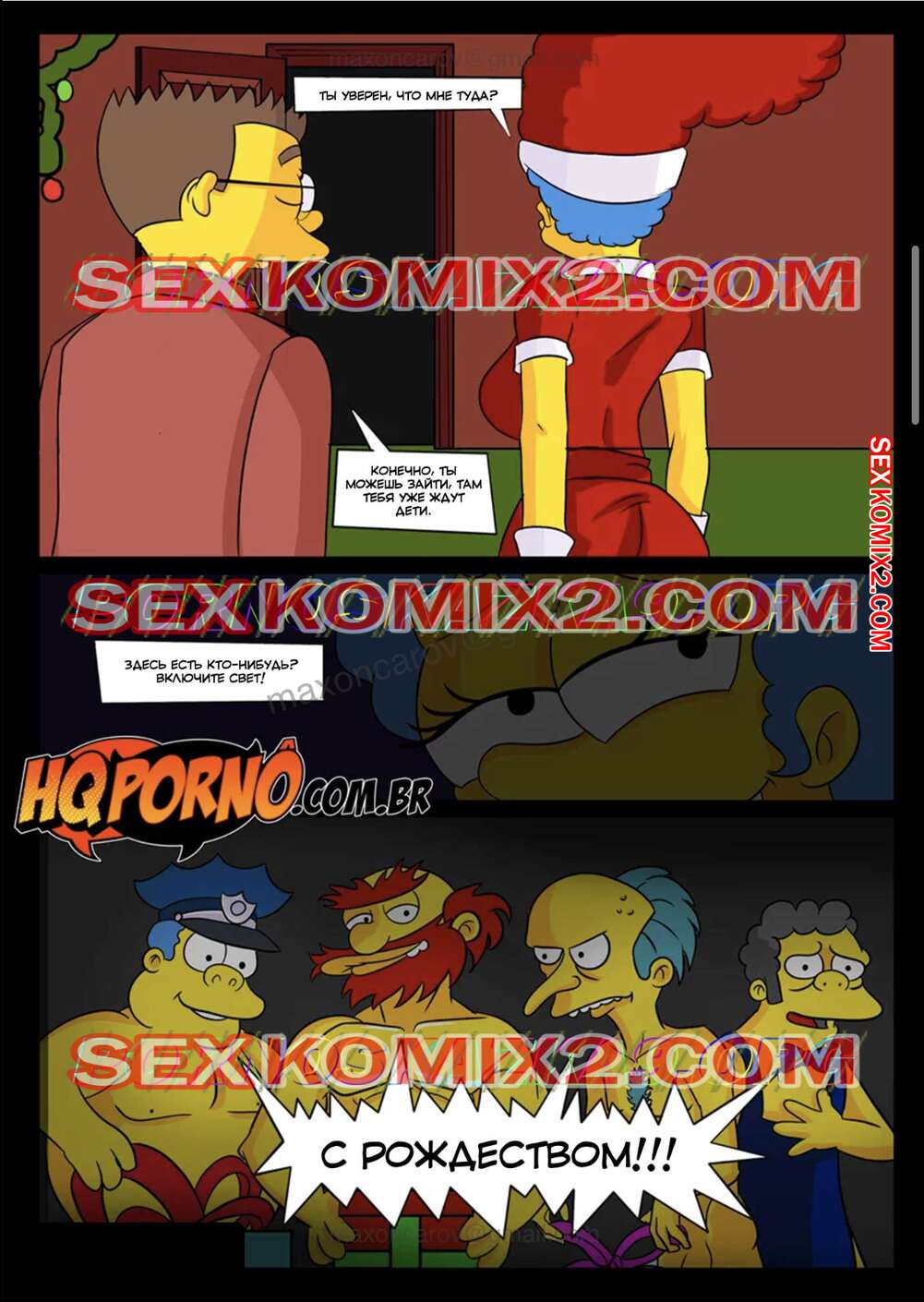 Порно комикс Симпсексы. Часть 8. Рождественский корпоратив. Os Simpsexys. HQPorno TZComiX Сисястая милфа Мардж решила повеселиться с друзьями мужа во время рождественской вечеринки. Она разделась перед ними и стала сосать их большие хуи, после чего дала им себя выебать во все дырочки.