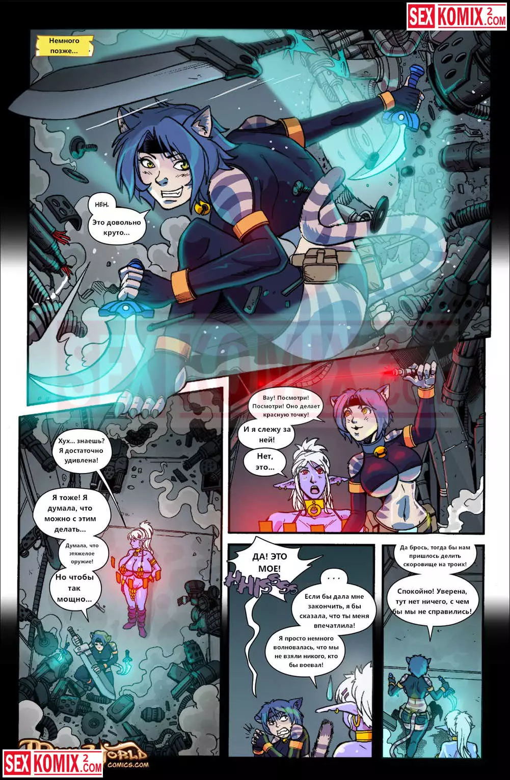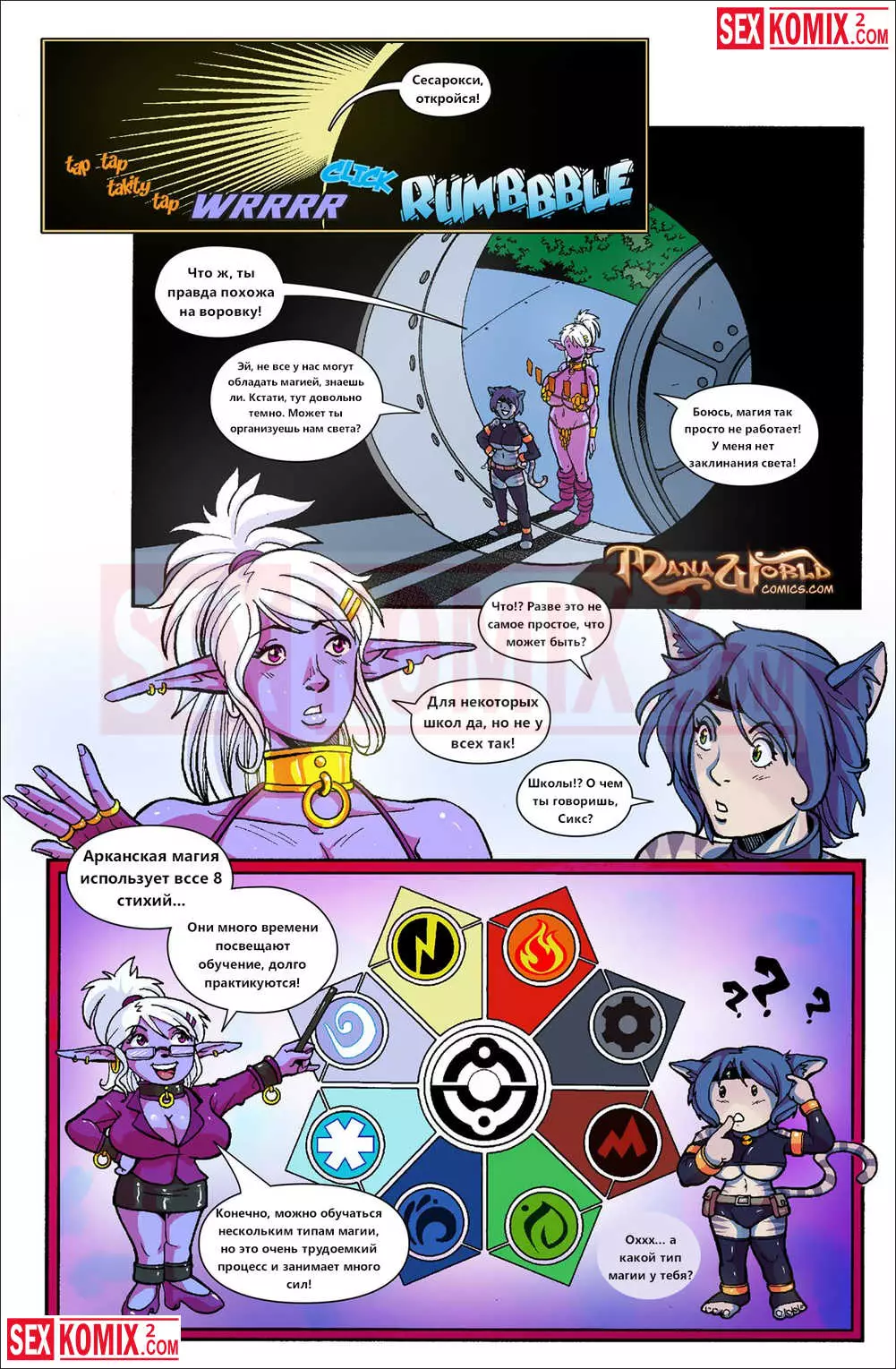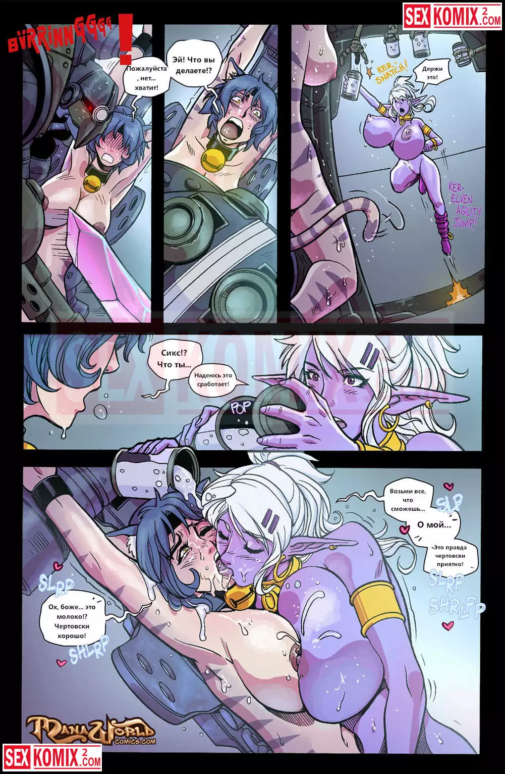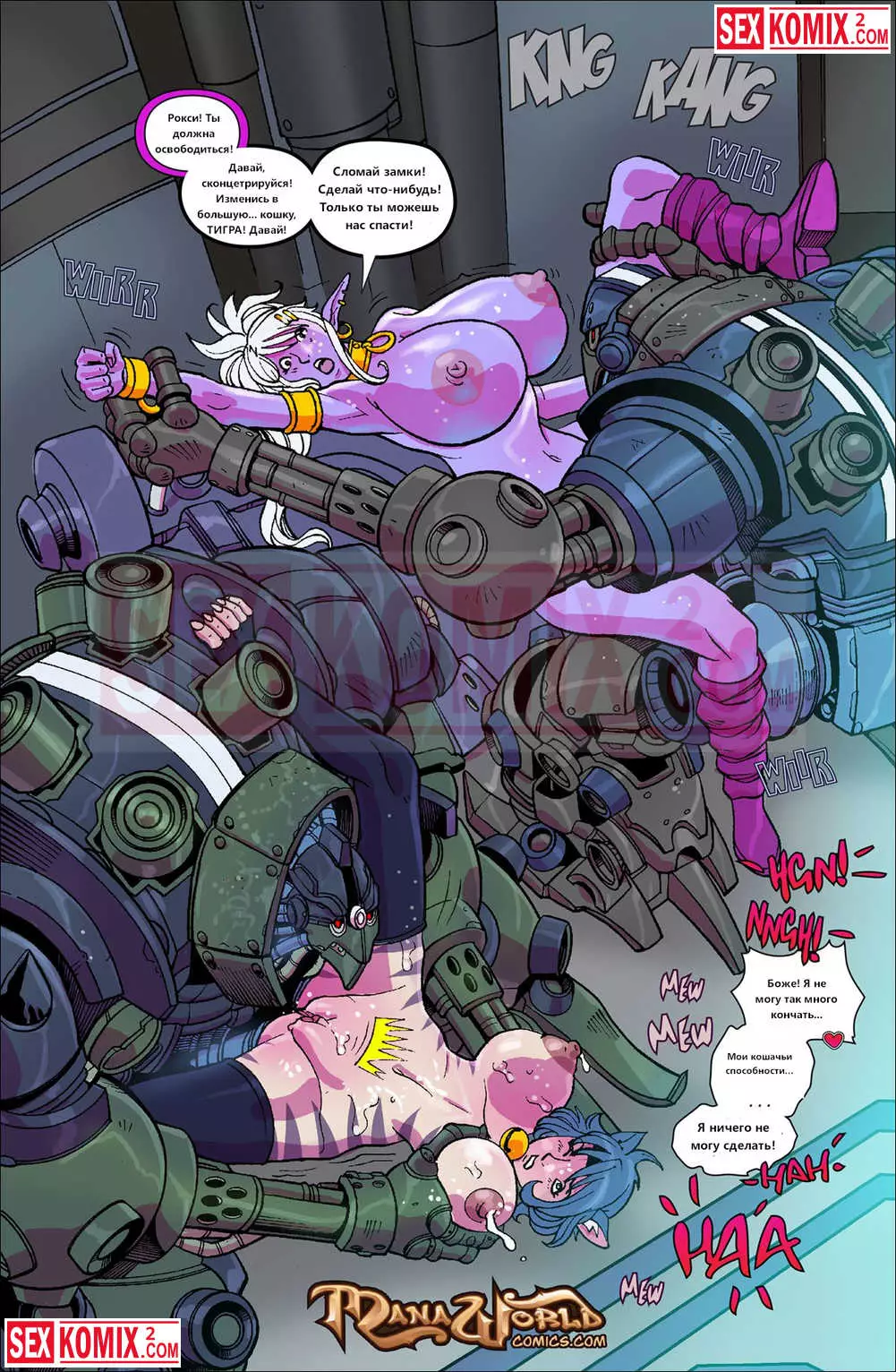 Порно комикс Mana World. Часть 16. Тяжелый металл. Горячие подружки эльфийка и женщина кошка попали в плен к роботизированной форме жизни. Механические парни устроили оргию с этими красотками и взяли их днк.