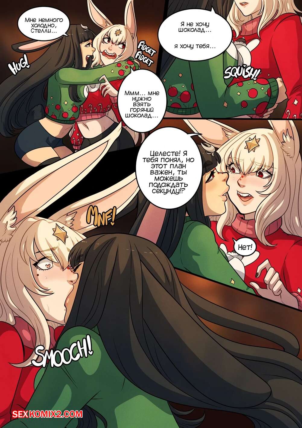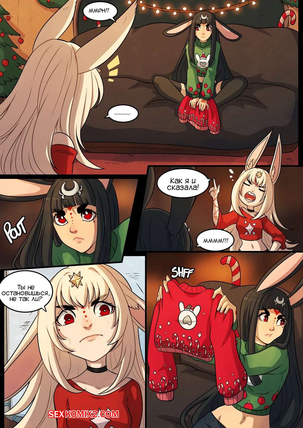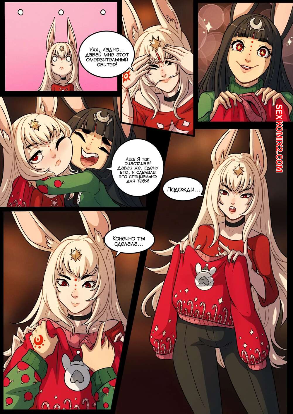 Порно комикс Очень кроличье Рождество. A Very Bunny Christmas. Kinkymation Горячая сисястая брюнетка очень возбудилась, увидев свою шикарную подругу в милом свитере, и решила с ней повеселиться. Она раздела ее и стала ласкать ее пизденку, после чего они занялись страстной лесбийской еблей.