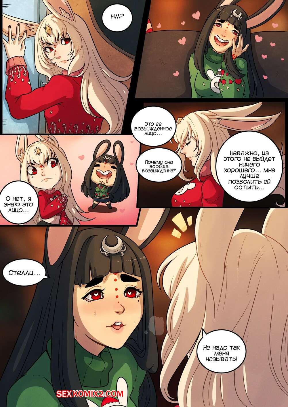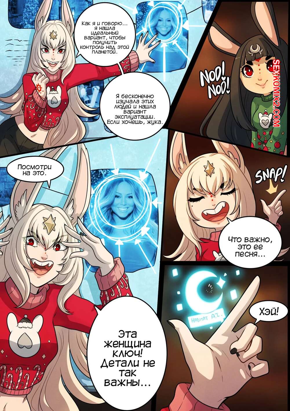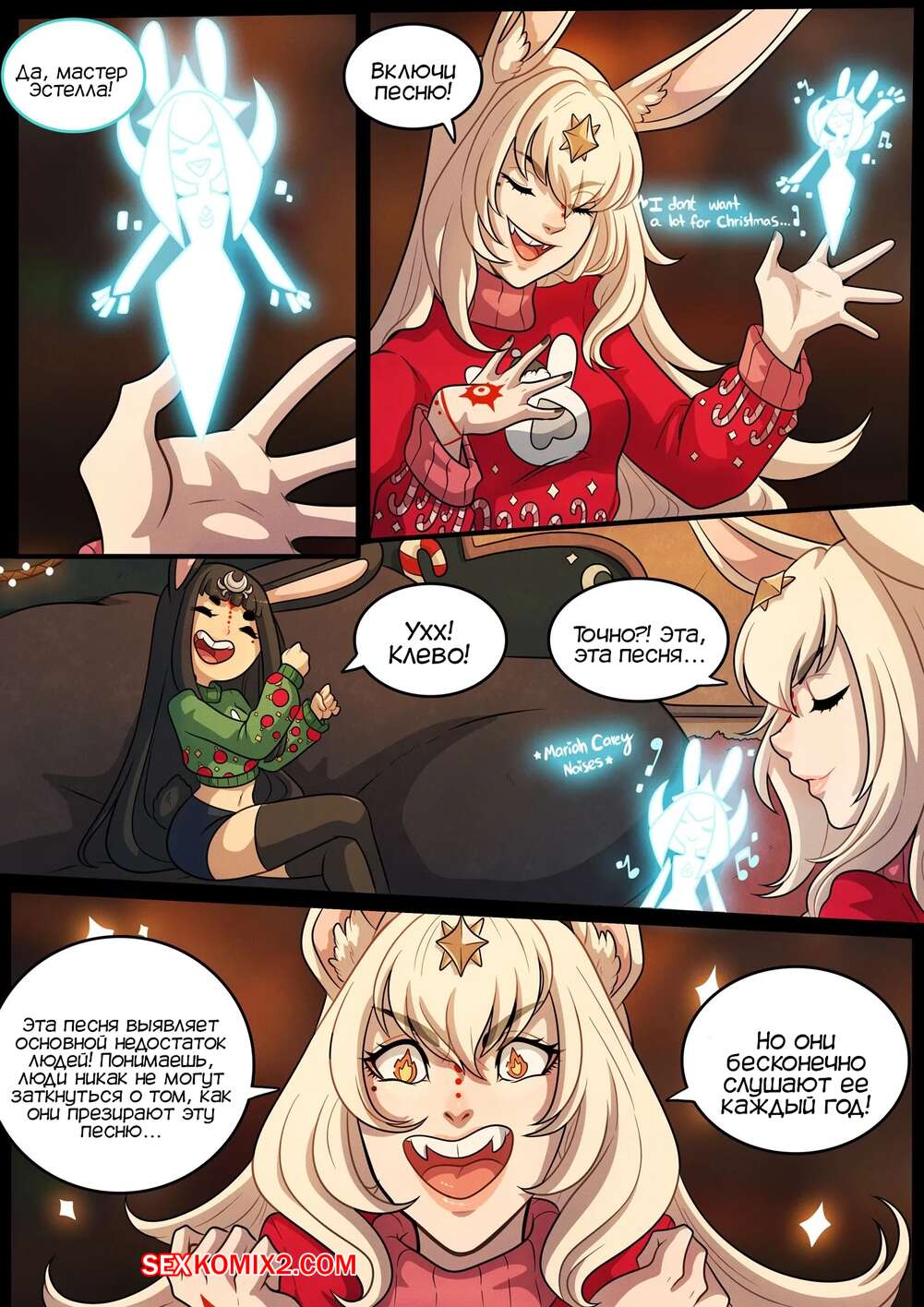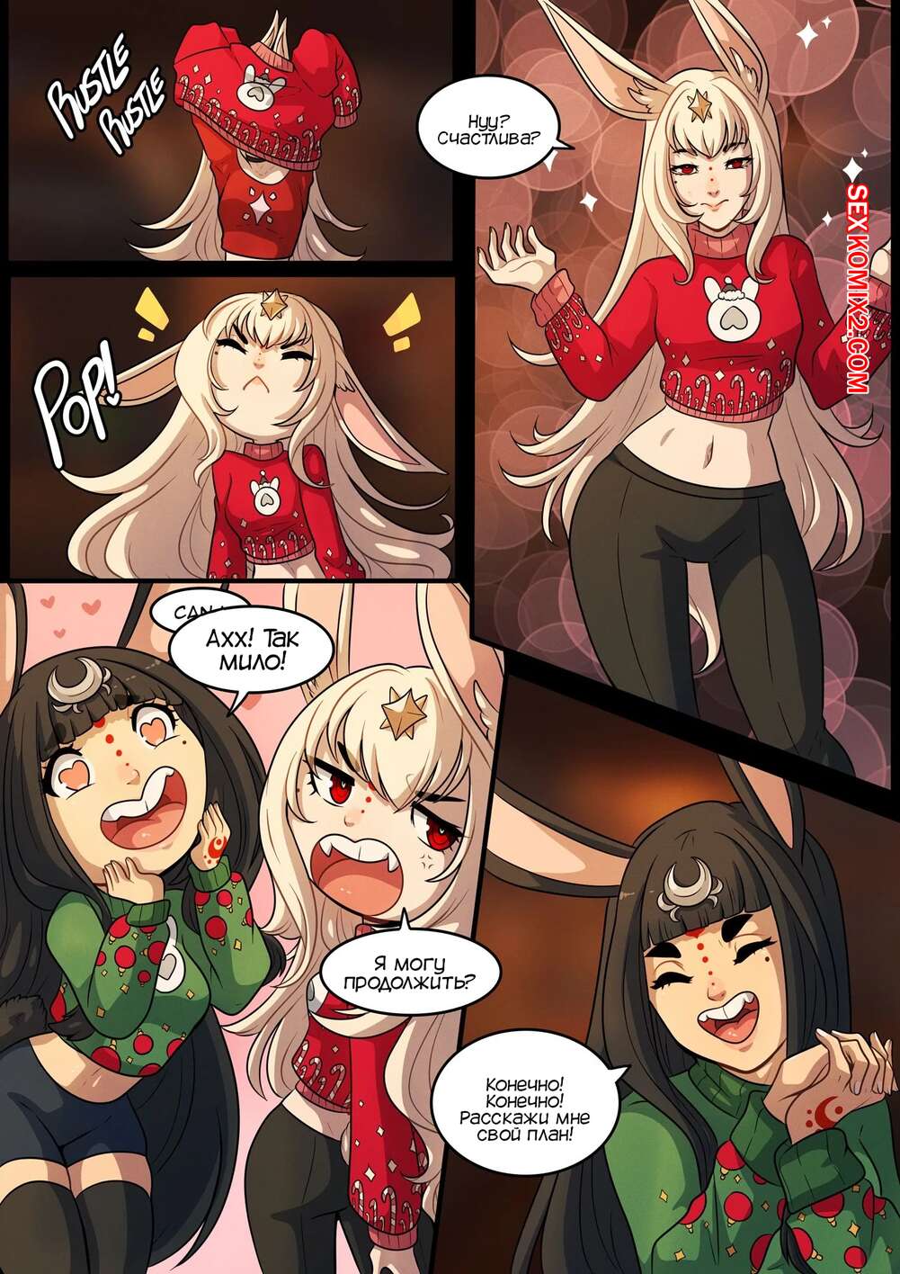 Порно комикс Очень кроличье Рождество. A Very Bunny Christmas. Kinkymation Горячая сисястая брюнетка очень возбудилась, увидев свою шикарную подругу в милом свитере, и решила с ней повеселиться. Она раздела ее и стала ласкать ее пизденку, после чего они занялись страстной лесбийской еблей.