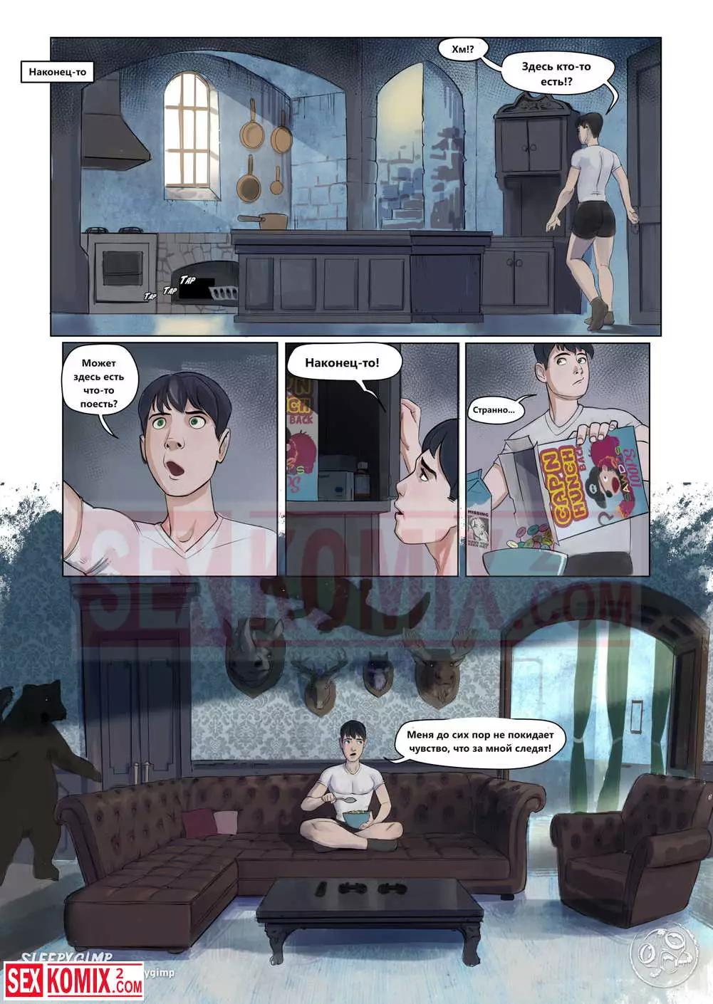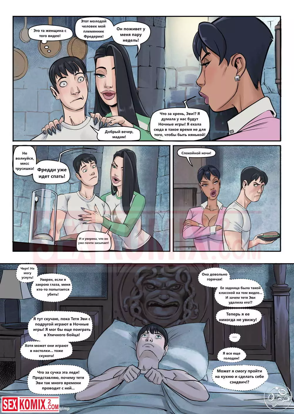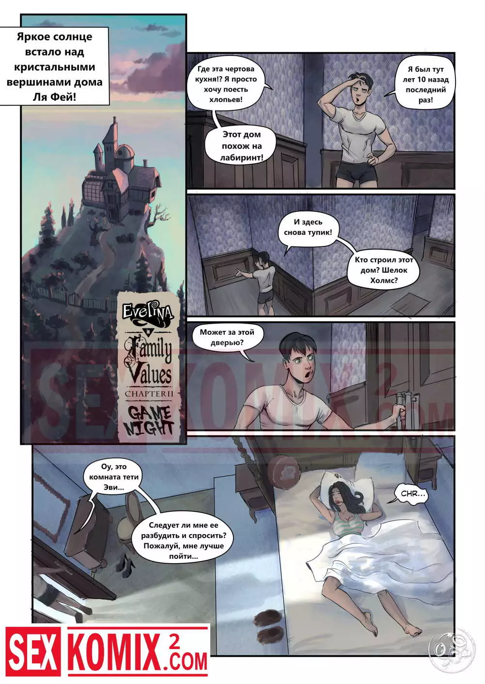 Порно комикс Семейные ценности. Часть 2. Парень проснулся после крепкого сна в доме своей тетушки, он случайно увидел как она спит голая, но не стал к ней приставать. Потом парень шёл порно фотографии с участием его тети и сильно возбудился.