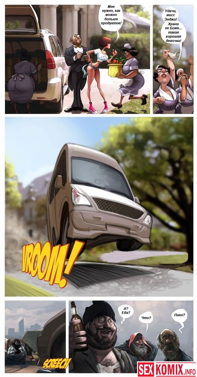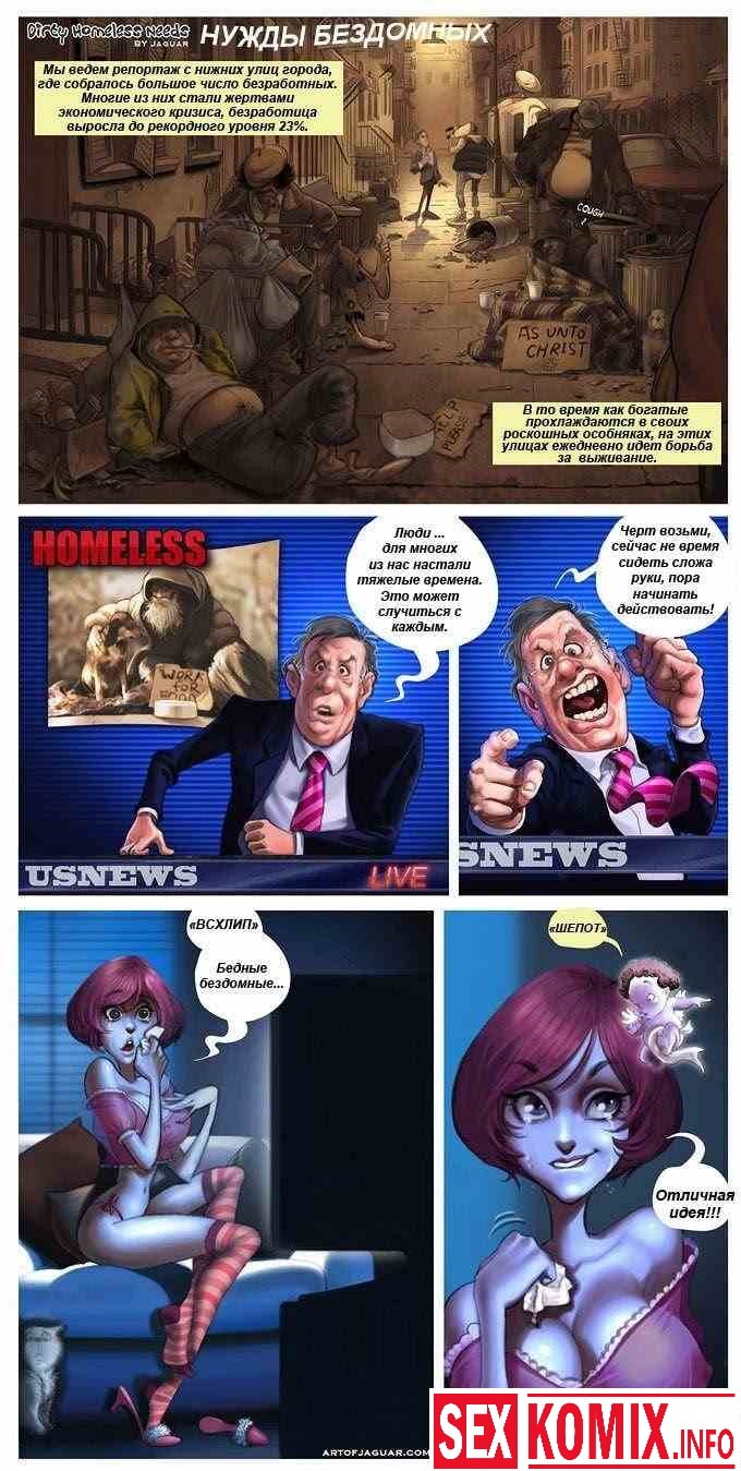 Порно комикс Нужды бездомных. В этом комиксе вы увидите как очень добрая девушка с деньгами и большими сиськами, решила оказать помощь бездомным. Она принялась раздавать еду и питье, но ее сексуальное тело возбудило в бомжах желание её трахнуть. Отказать этим беднягам красотка не смогла и занялась с ними грязным сексом.