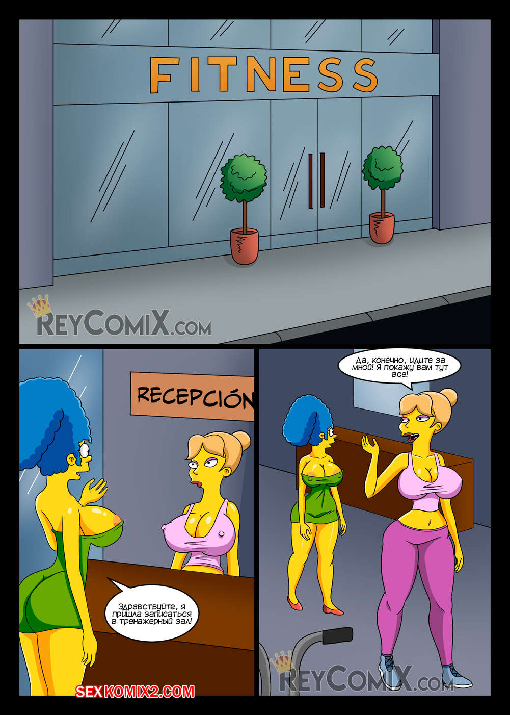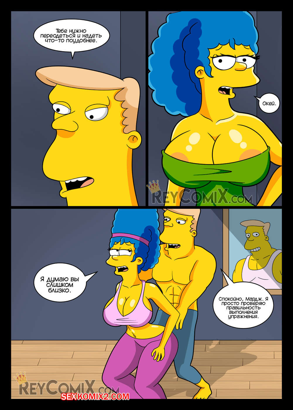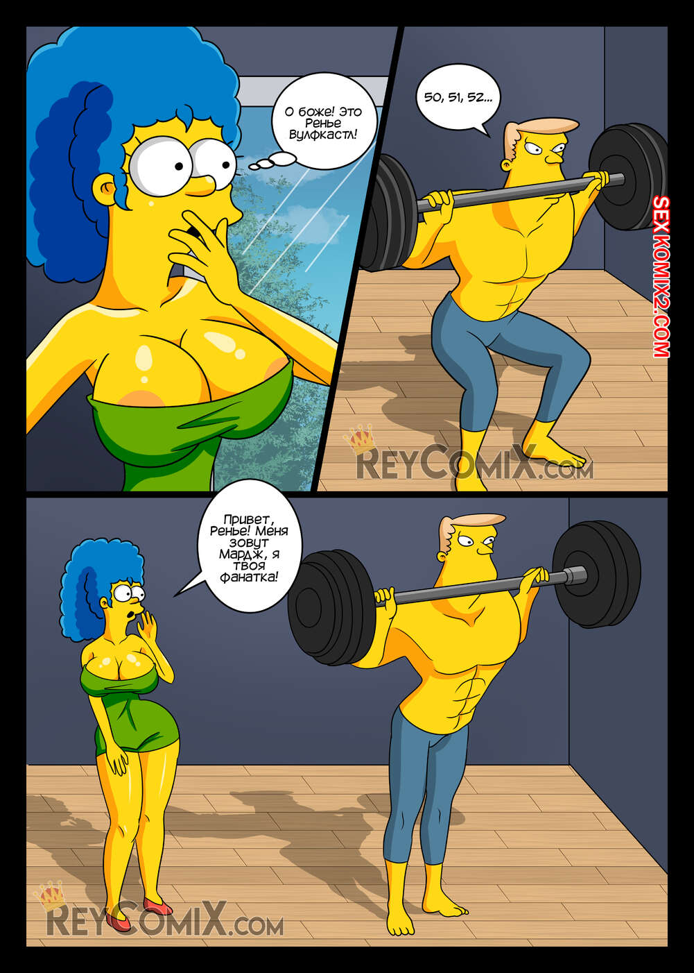 Порно комикс Симпсоны. Лос Симпсоны. Тренажерный зал. Los Simpsons. GYM. Exclusivo ReyComiX Сисястая милфа Мардж отправилась в тренажерный зал, где привлекла внимание накаченного парня. Он стал ее тренировать, после чего достал свой большой хуй и хорошенько выебал красотку.