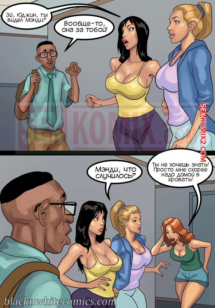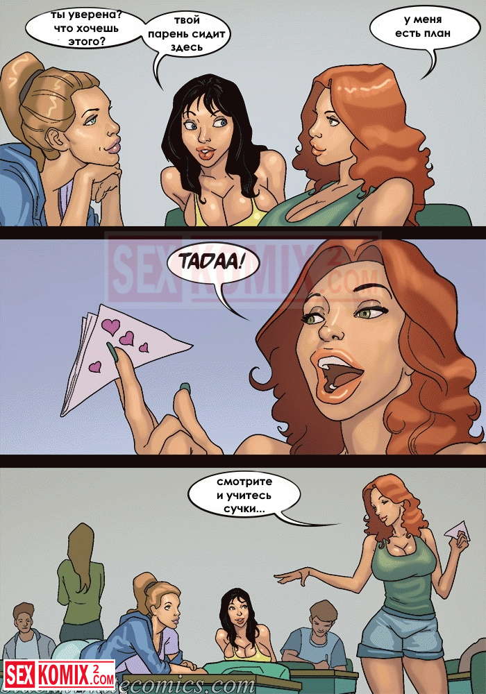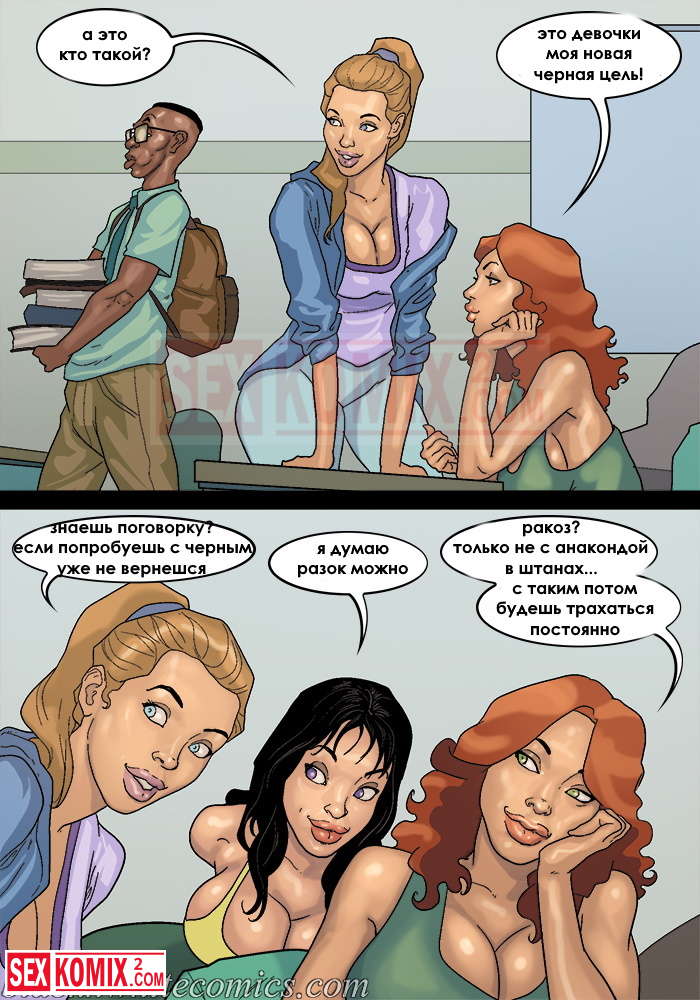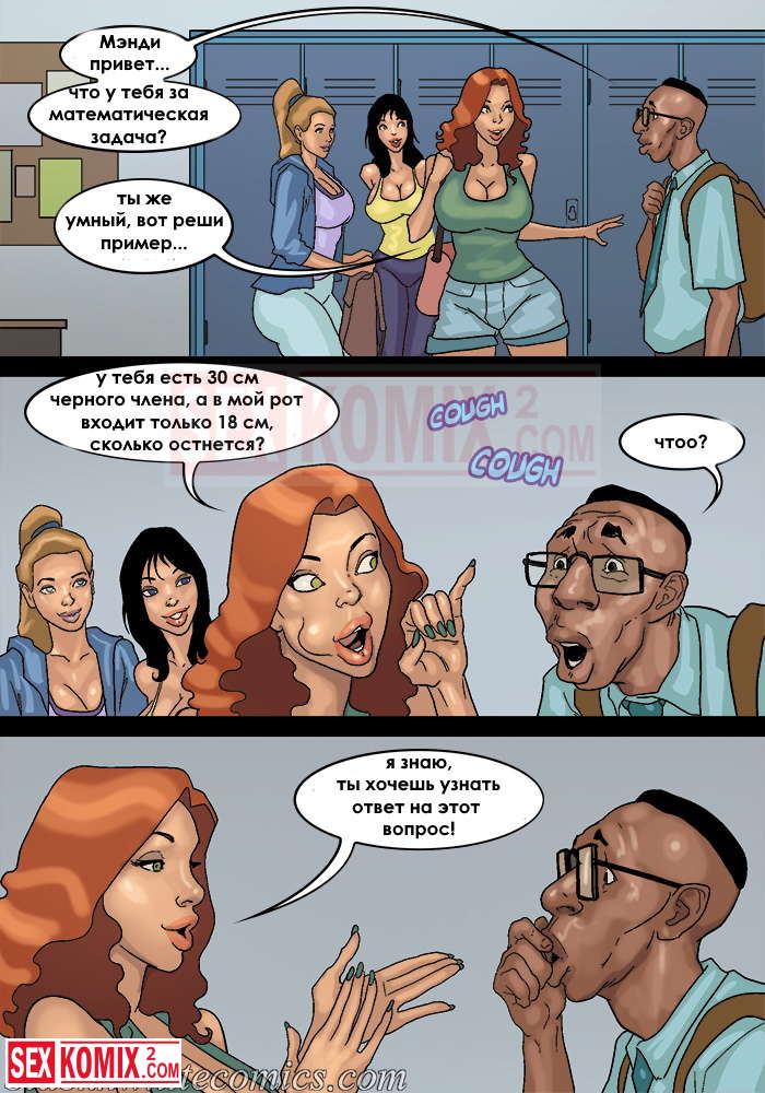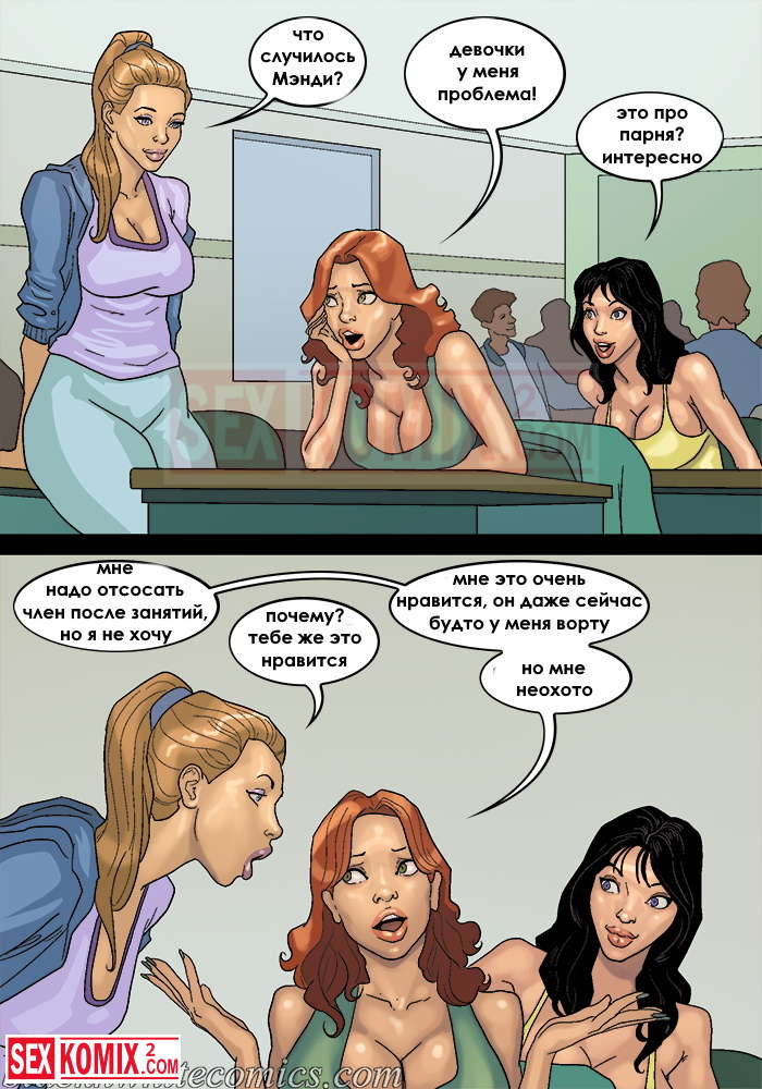 Порно комикс После уроков. Часть 3. Озабоченные девушки снова донимают парня с огромным членом. Они договариваются и трахаются в ним по очереди во время перерыва. Как парень всё это выдерживает смотрите в этой истории.