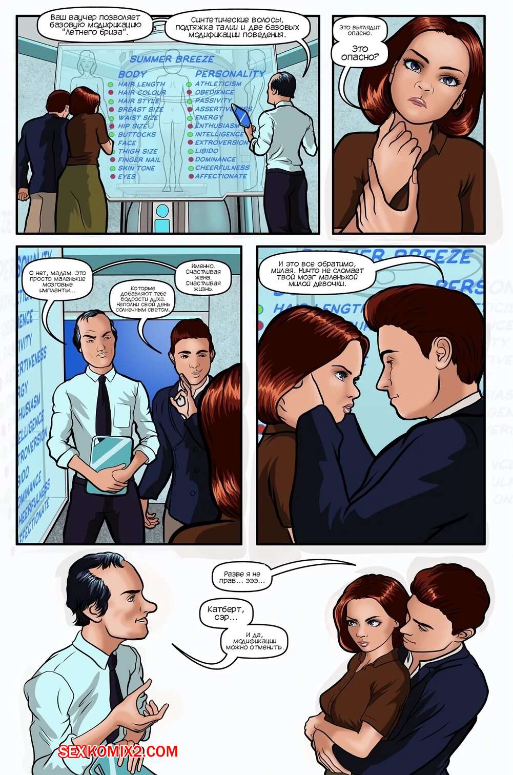 Порно комикс Времена года. Летний бриз. Часть 1. Seasons Summer Breeze. mindcontrolcomics Парень отдал хорошие деньги, чтобы изменить внешность своей жены. Теперь она стала сексуальной блондинкой с большими сиськами, которая постоянно желает трахаться, от чего парень просто в шоке.