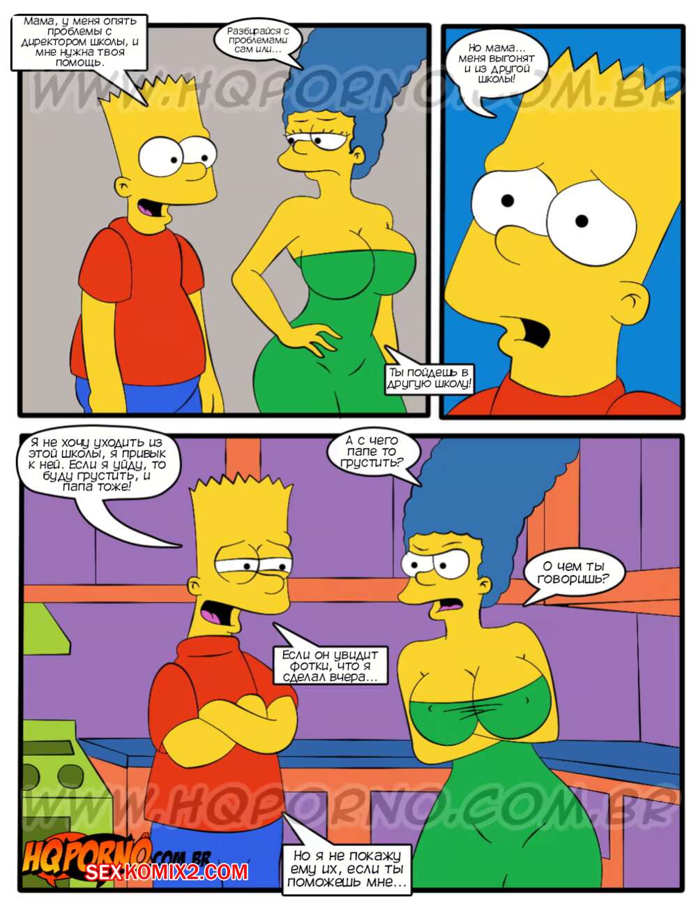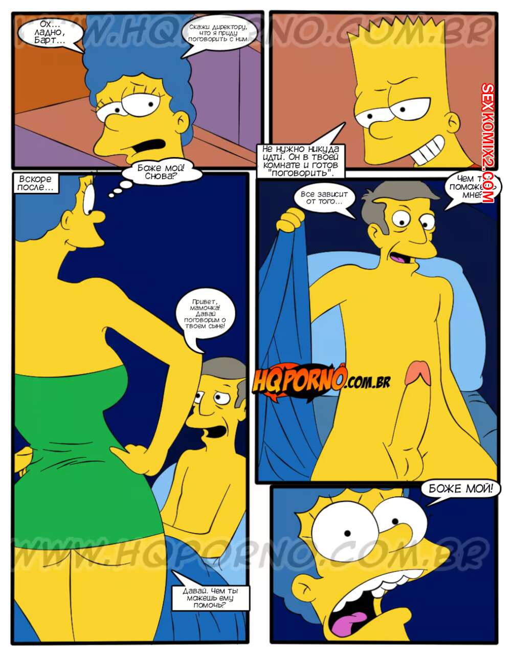Порно комикс Симпсексы. Часть 15. Шантаж. Os Simpsexys. HQPorno У Барта возникли проблемы в школе и он обратился за помощью к маме, чтобы она пообщалась с директором. Сучка уединилась с директором в спальне и дала ему себя выебать в обмен на то, чтобы он не исключал Барта из школы.