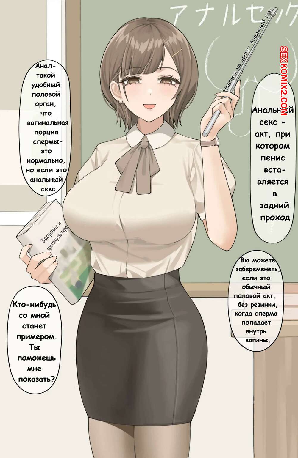 Порно комикс Учитель на уроке анального секса. Hyouuma Сексуальная училка милфа решила преподать урок анального секса своему ученику. Красотка разделась и возбудила парня своим шикарным телом, после чего дала ему себя выебать в попку.