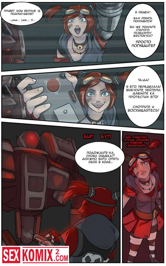 Порно комикс Гейдж. Приграничные земли. Девушка собрала робота и хотела показать своим подписчикам как он работает, но что-то пошло не так и он трахнул девушку.
