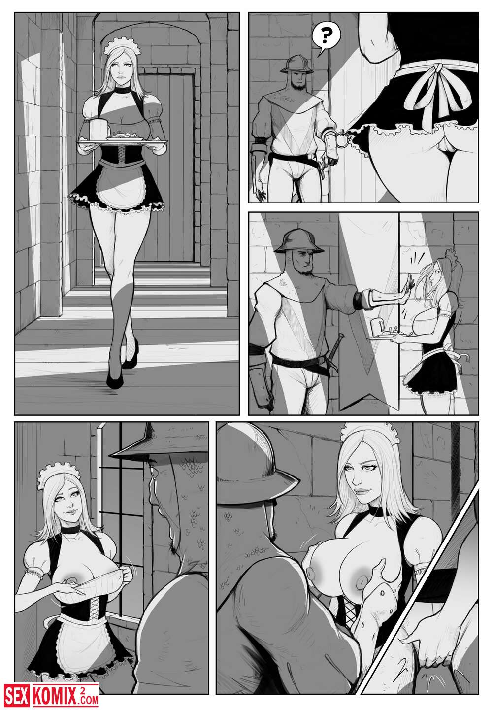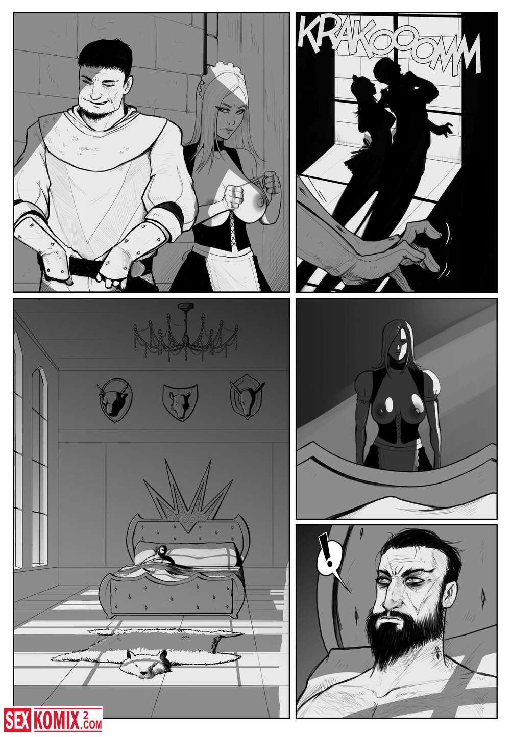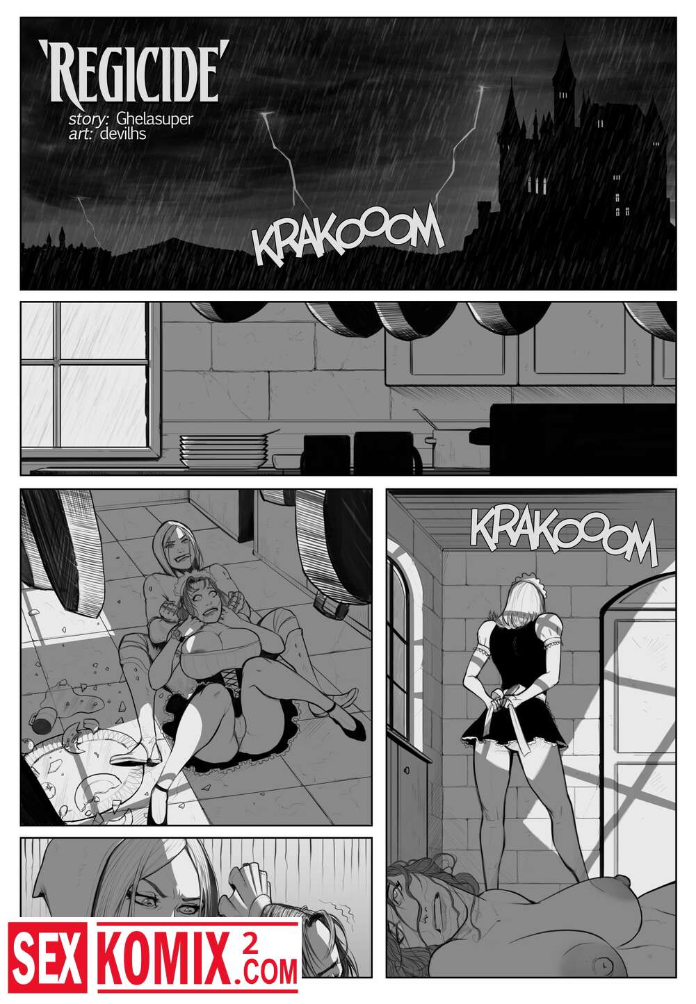 Порно комикс Цареубийца. Девушка проникла в дом, оделась в костюм служанки и пошла в покои хозяина дома.