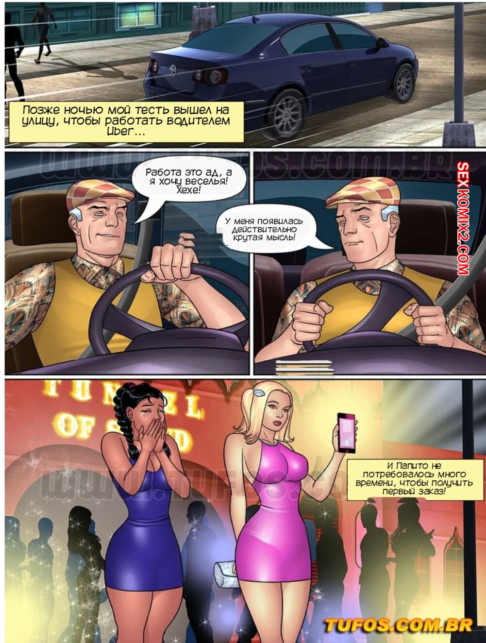Порно комикс Папочка. Тесть извращенец. Часть 4. Tufos Кристофера уволили, поэтому его отец решил устроиться в Убер. Ночью он подвозил двух горячих красоток, одной из которых изменил парень. Дедуля решил помочь ей отомстить, поэтому достал свой хуй и выебал обеих красоток, кончив им на лицо.
