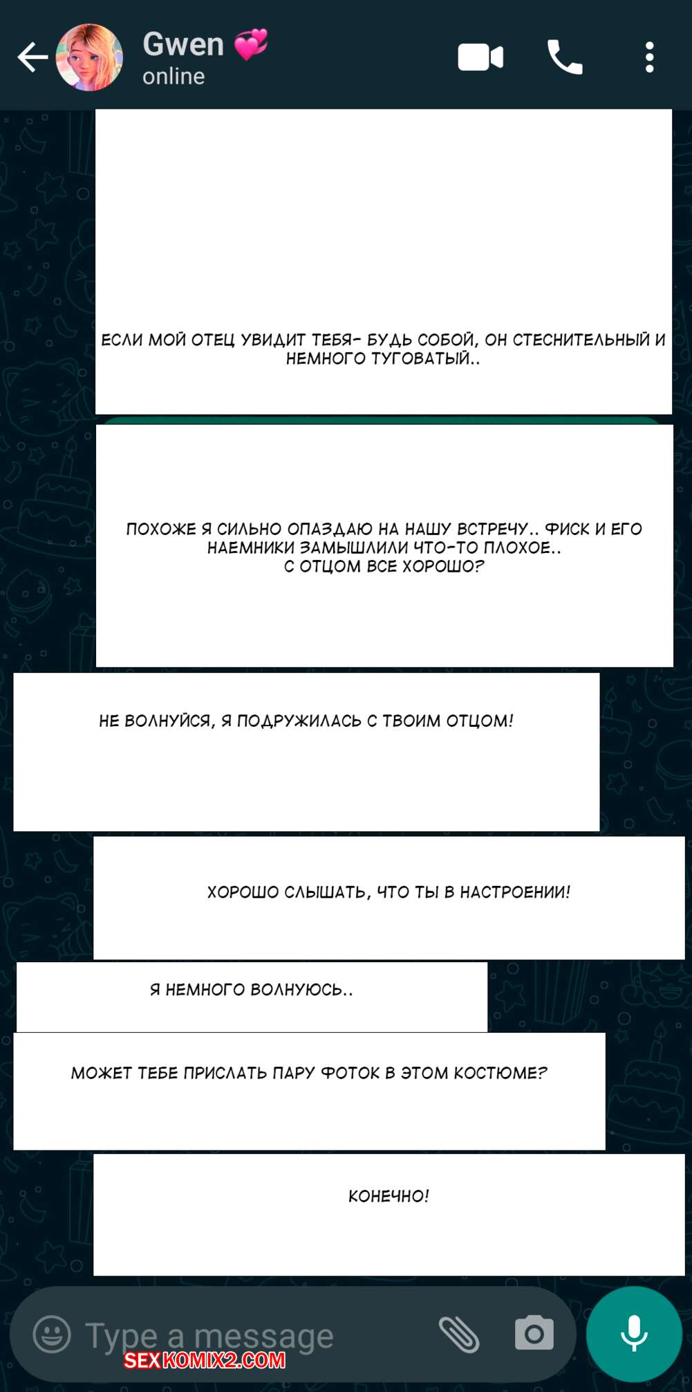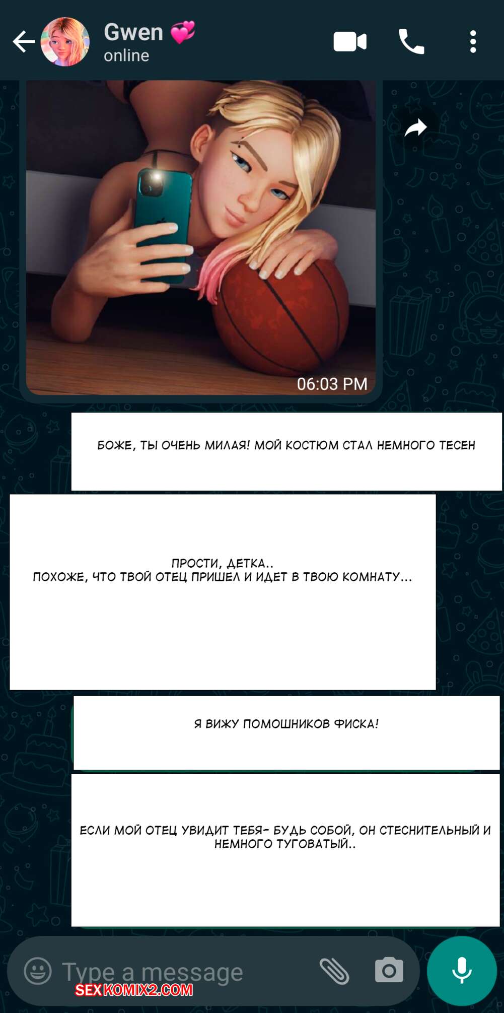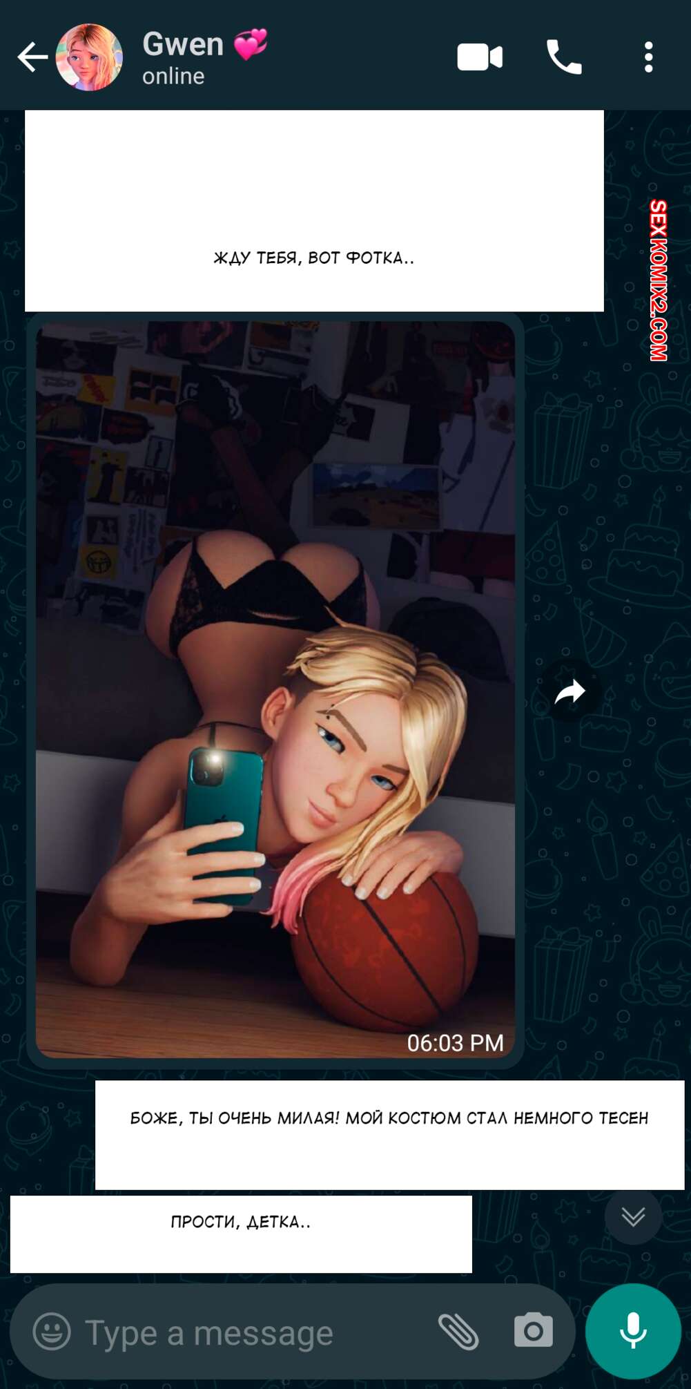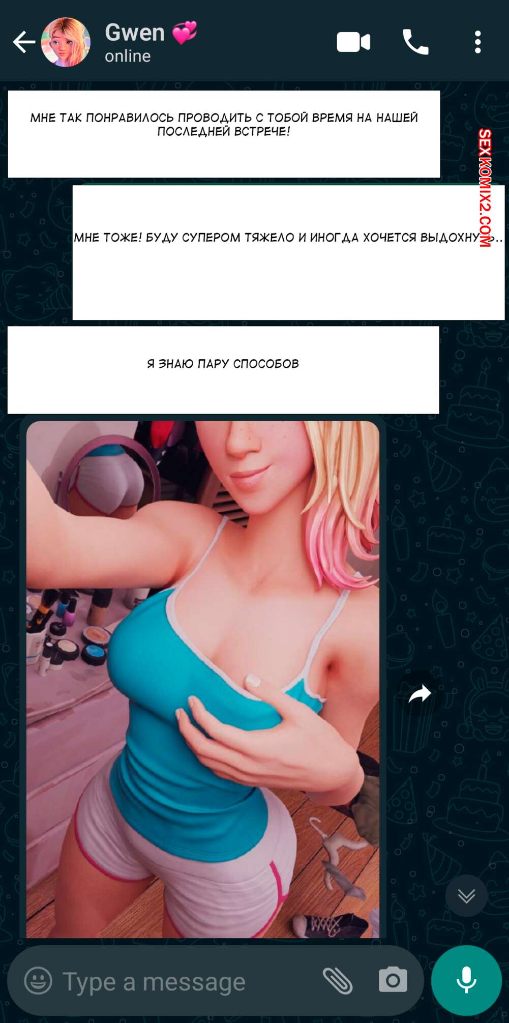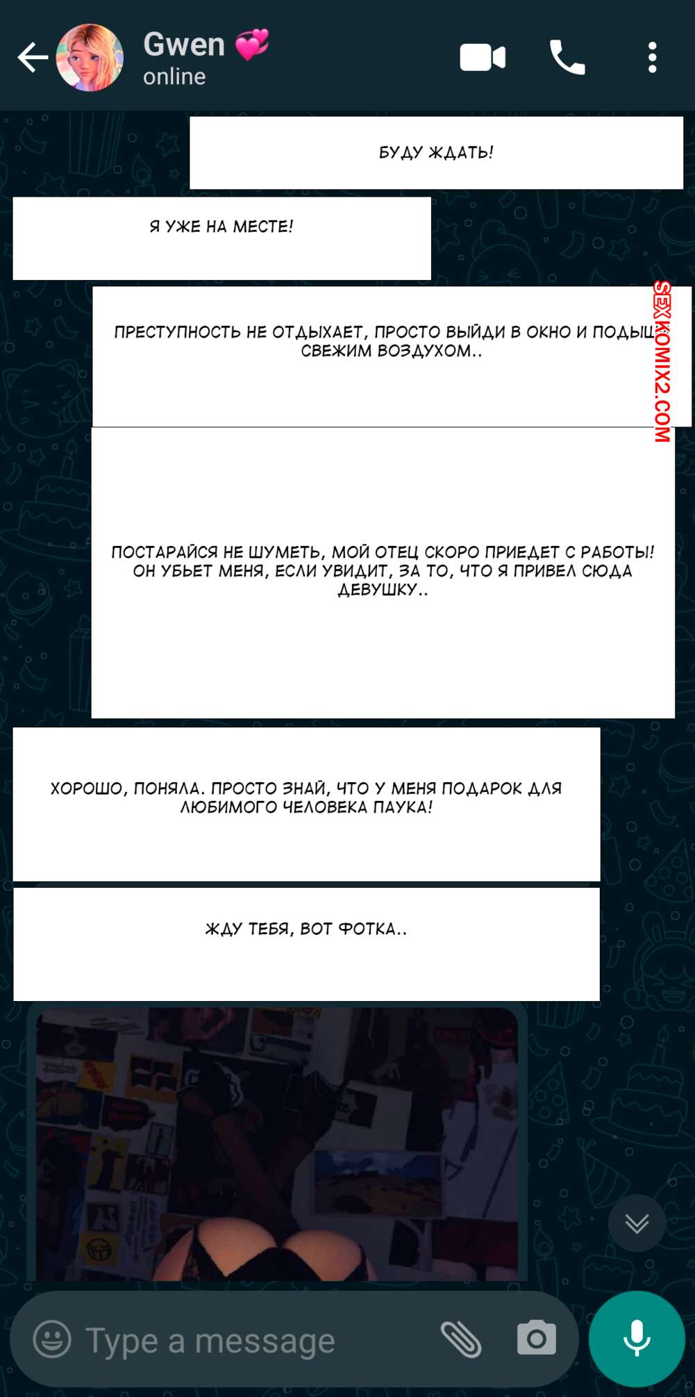 Порно комикс Гвен. Комиссионная работа. Commission Work. Spider Gwen. Красотка Гвен в чате договорилась о сексе. Помылась и пошла на еблю с черным хуем.