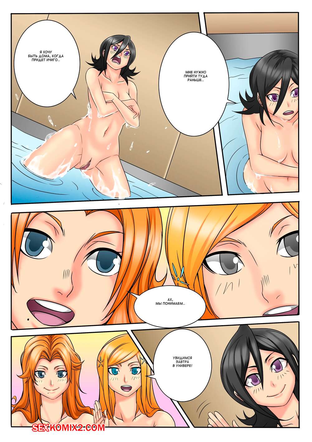 Порно комикс Bleach. История « Что если ». Часть 1. A What If Story. TSFSingularity. Горячая сексуальная брюнетка внезапно сильно возбудилась. Она повеселилась со своим подругами, принимая ванну, после чего отправилась домой, где стала ласкать свою пизденку.