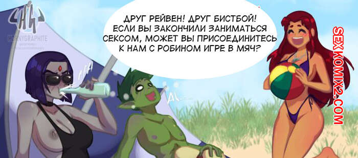 Порно комикс Teen Titans. День на пляже. Raven x Beast Boy x Starfire. Hornygraphite Во время отдыхала на пляже у парня Зверя встал член и он обратился за помощью к Рейвен. Красотка отсосала большой хуй своего дружка и дала ему себя выебать, после чего к ним присоединилась Старфайр и они занялись групповой еблей.