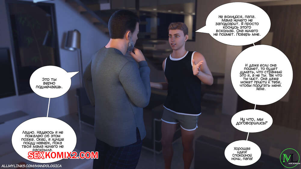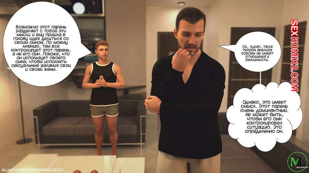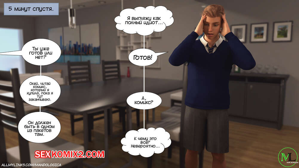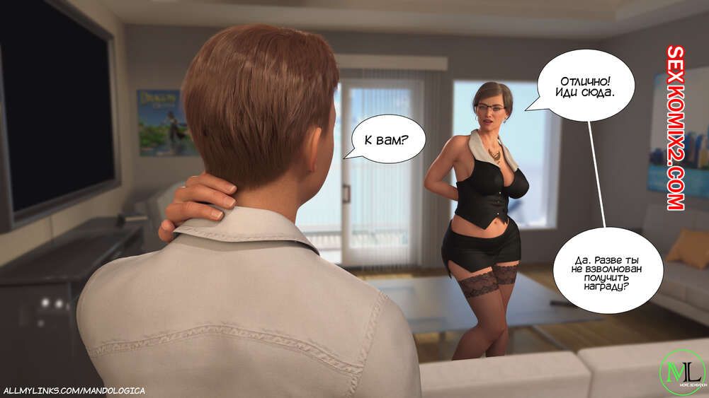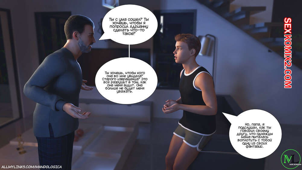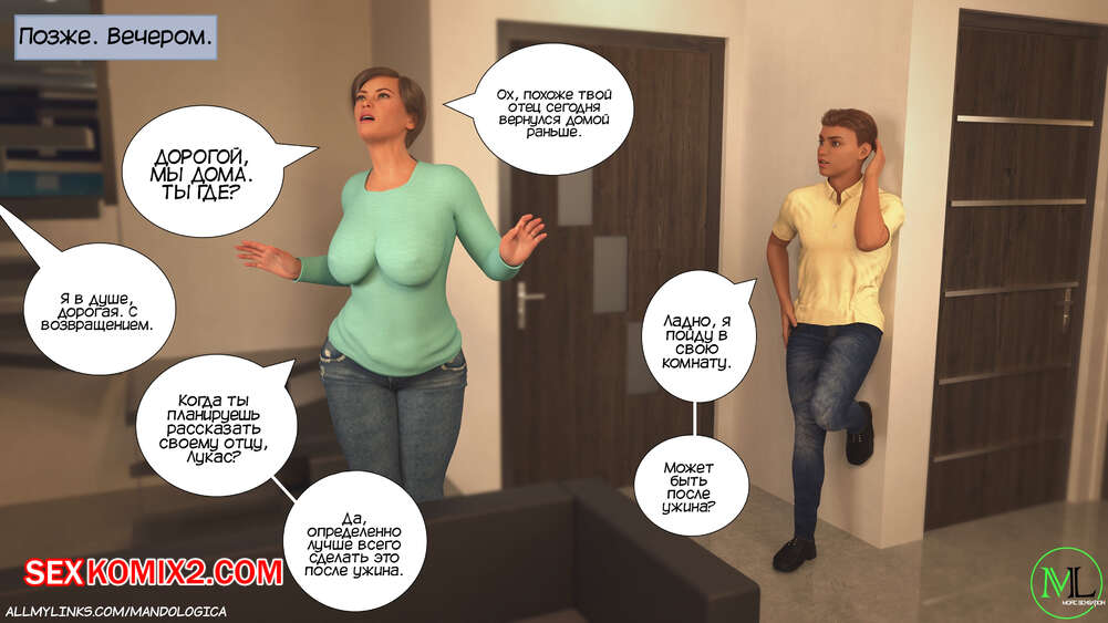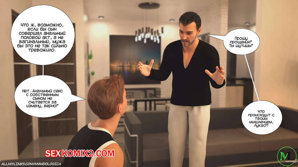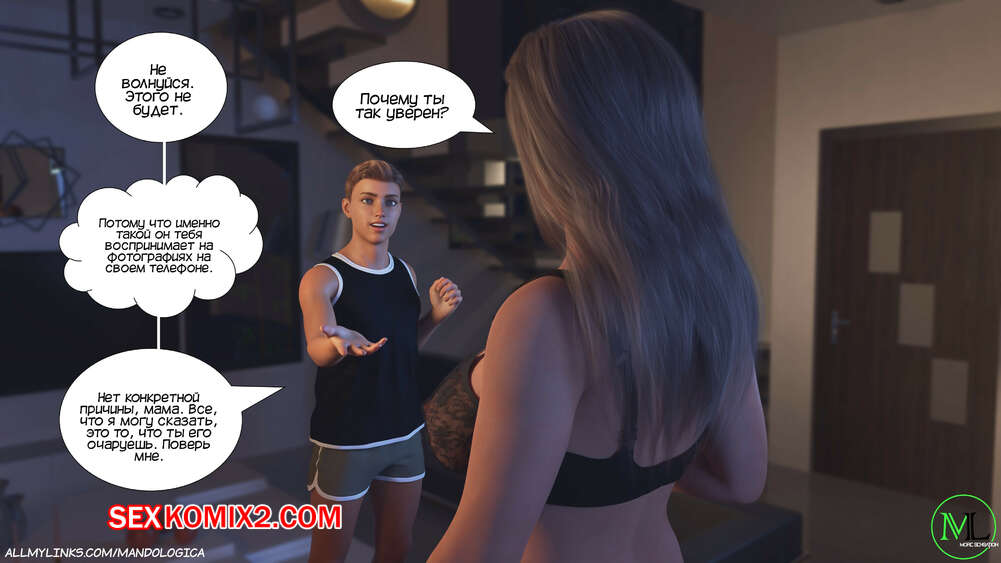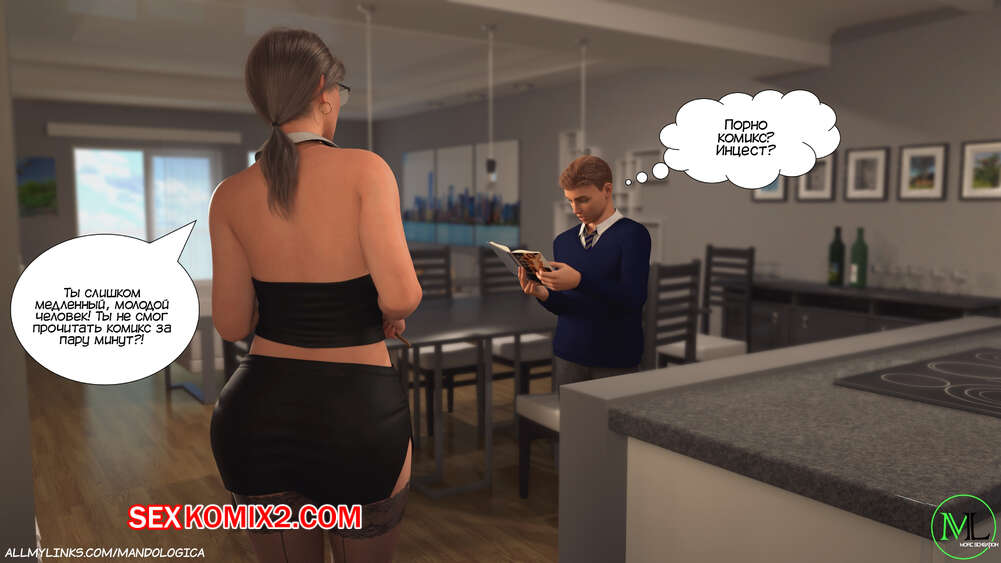 Порно комикс Разрушение границ. Часть 7. Breaking Boundaries. MandoLogica Адрианна купила сексуальный наряд, чтобы воплотить сексуальную фантазию Лукаса. Красотка дала ему почитать комикс, а сама стала вертеть перед ним своей задницей, соблазняя сына.