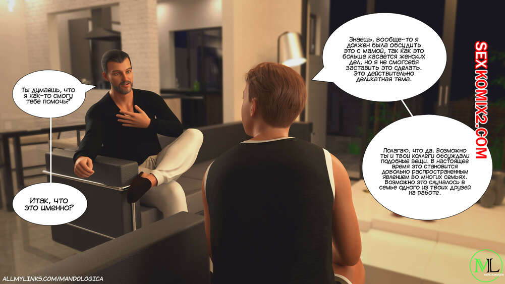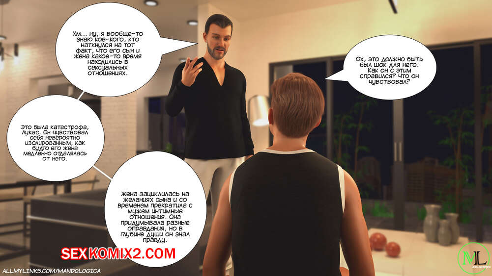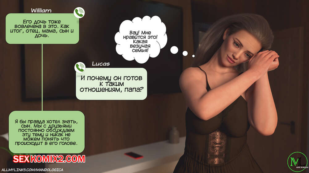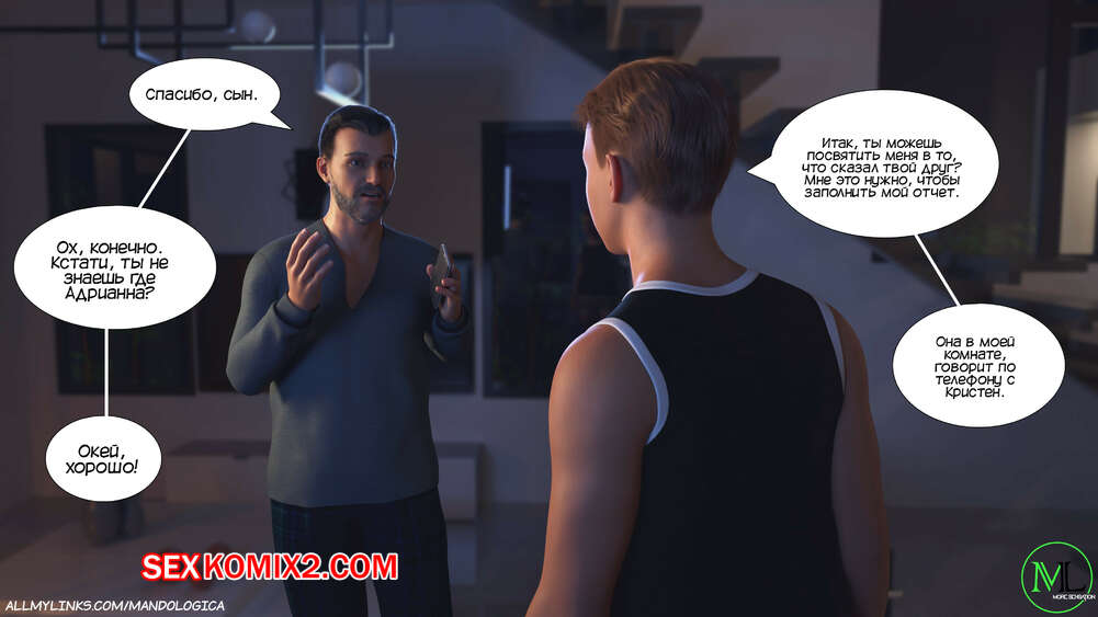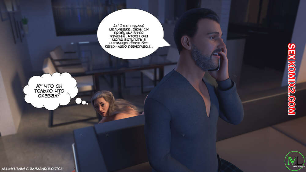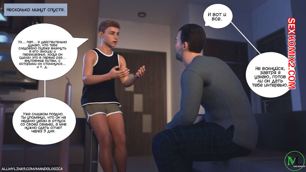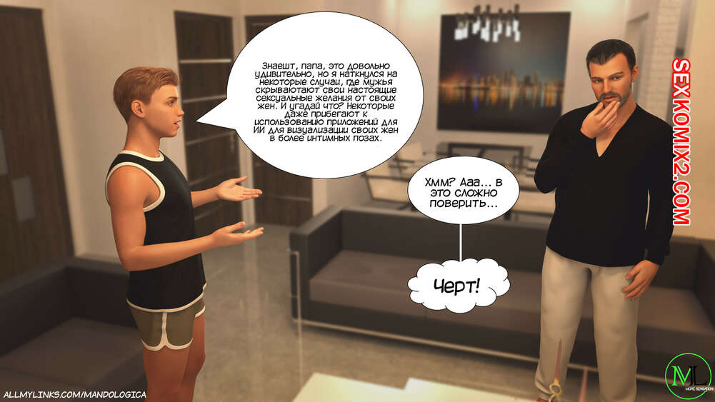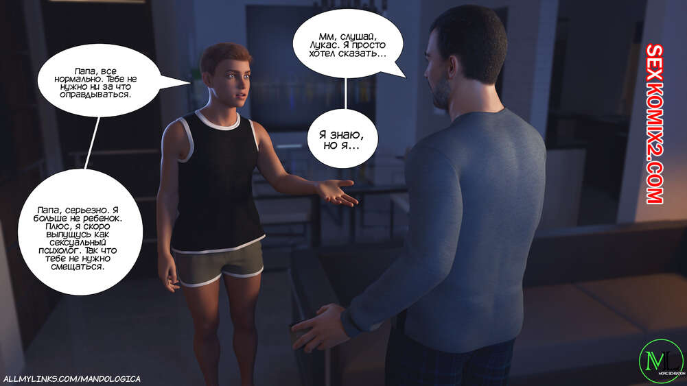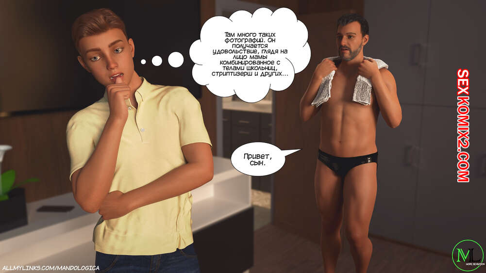 Порно комикс Разрушение границ. Часть 7. Breaking Boundaries. MandoLogica Адрианна купила сексуальный наряд, чтобы воплотить сексуальную фантазию Лукаса. Красотка дала ему почитать комикс, а сама стала вертеть перед ним своей задницей, соблазняя сына.