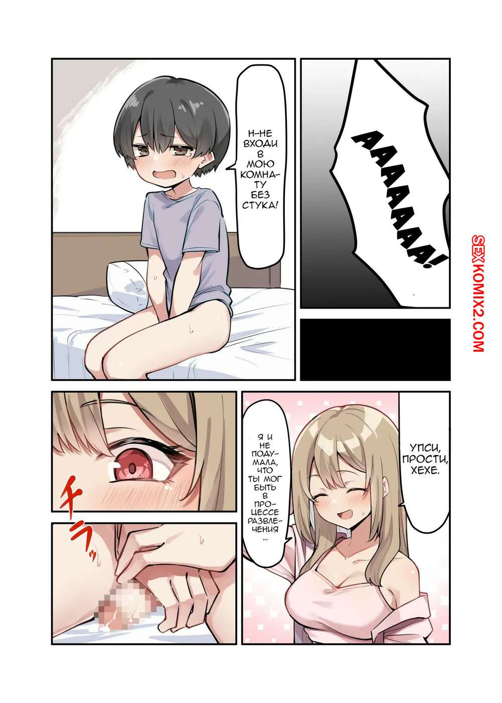 Порно комикс Гяру Старшеклассница Сестра И Сёта. Часть 3. MM Молодой парнишка дрочил член в своей комнате и ее сестренка решила ему помочь. Девушка встала на колени и стала сосать хуй парня, после чего он кончил ей в руку.