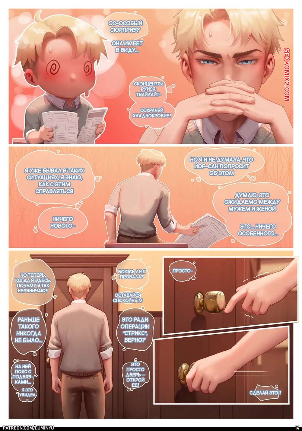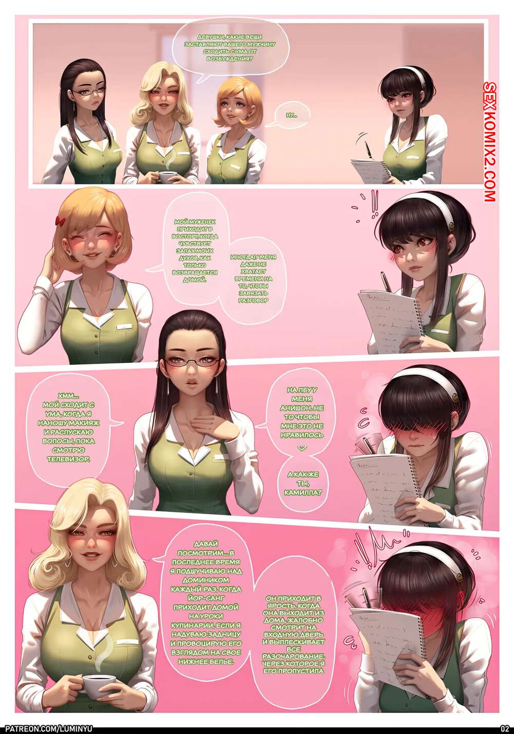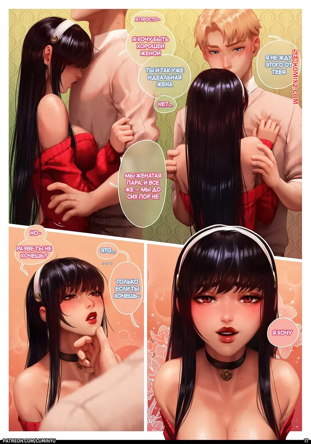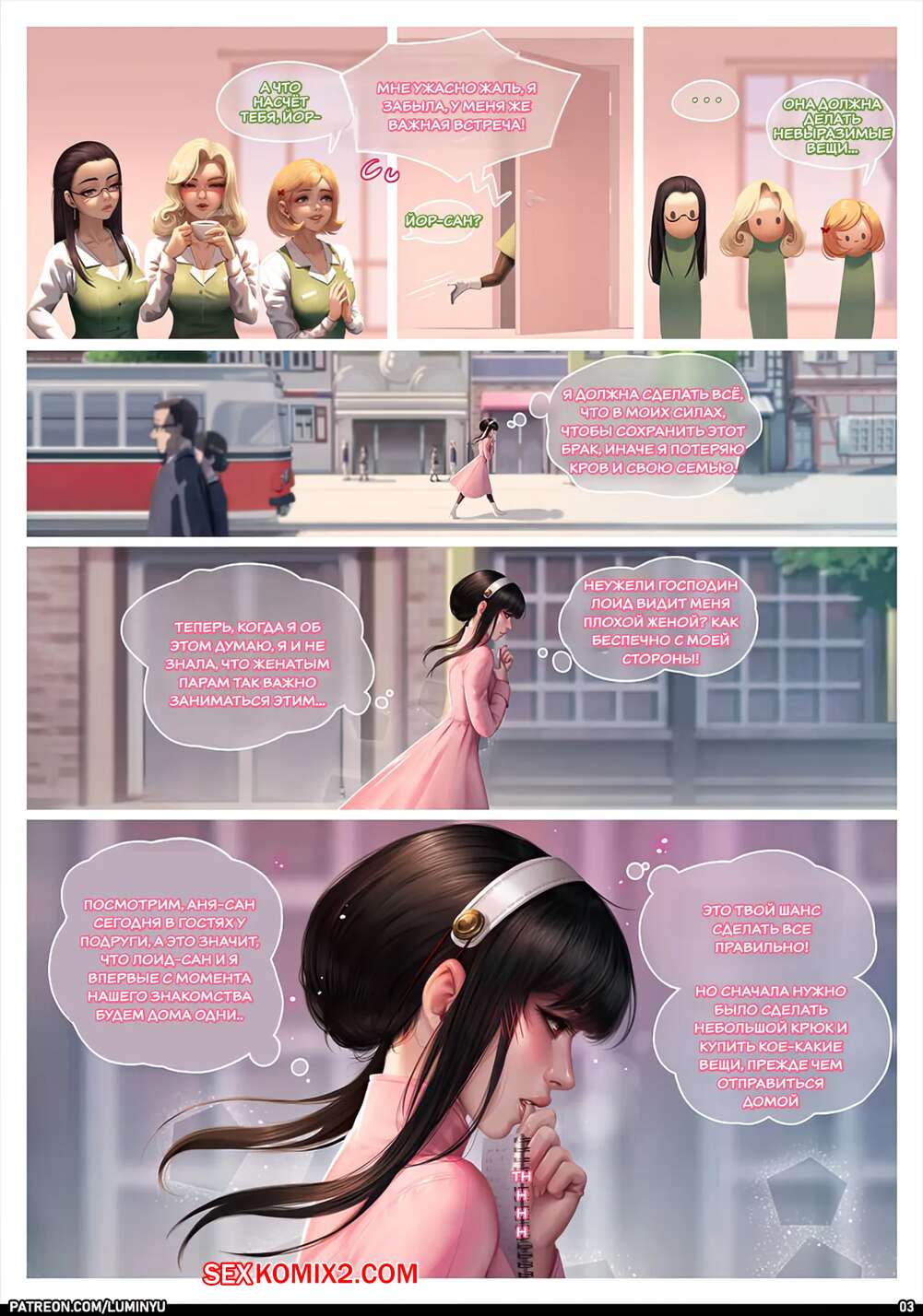 Порно комикс Spy x Family. Люмин Ю. LumiNyu Горячая брюнетка подслушивает разговоры своих замужних коллег, желая вывести на новый уровень свою сексуальную жизнь с любимым. Девушка пришла домой и пошла принимать душ, желая поскорее заняться сексом с парнем.