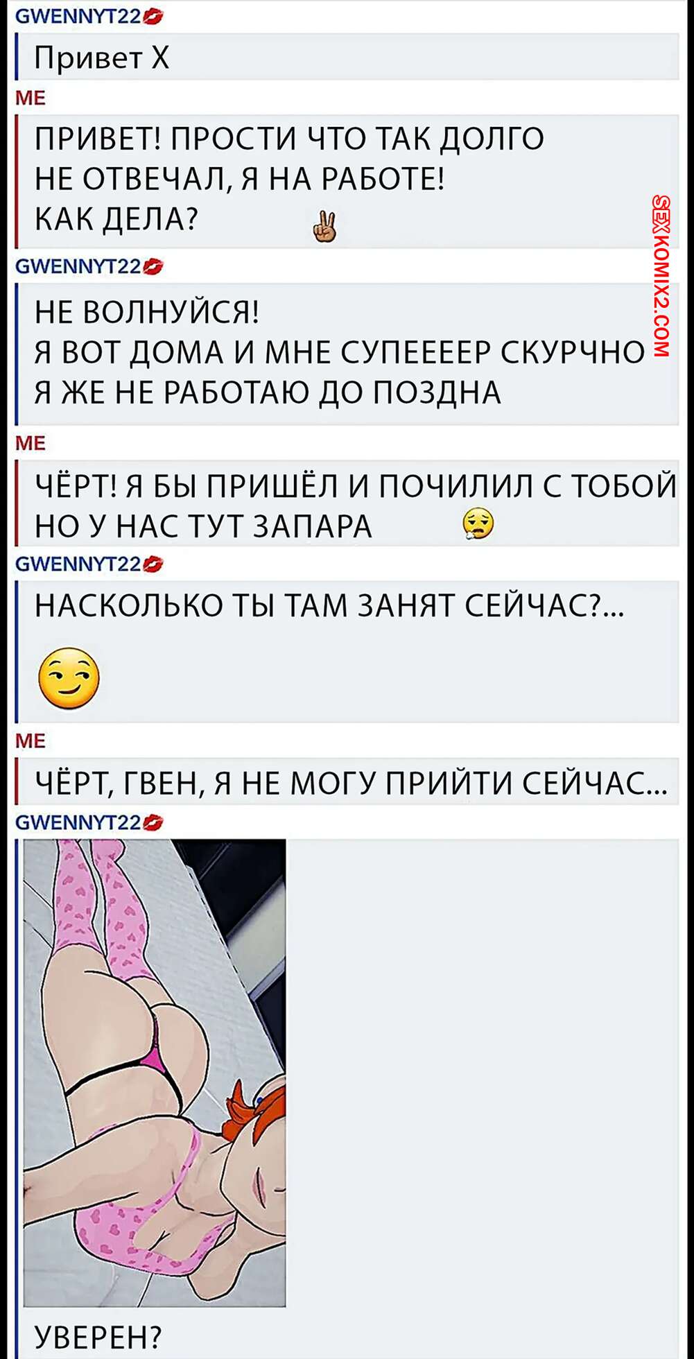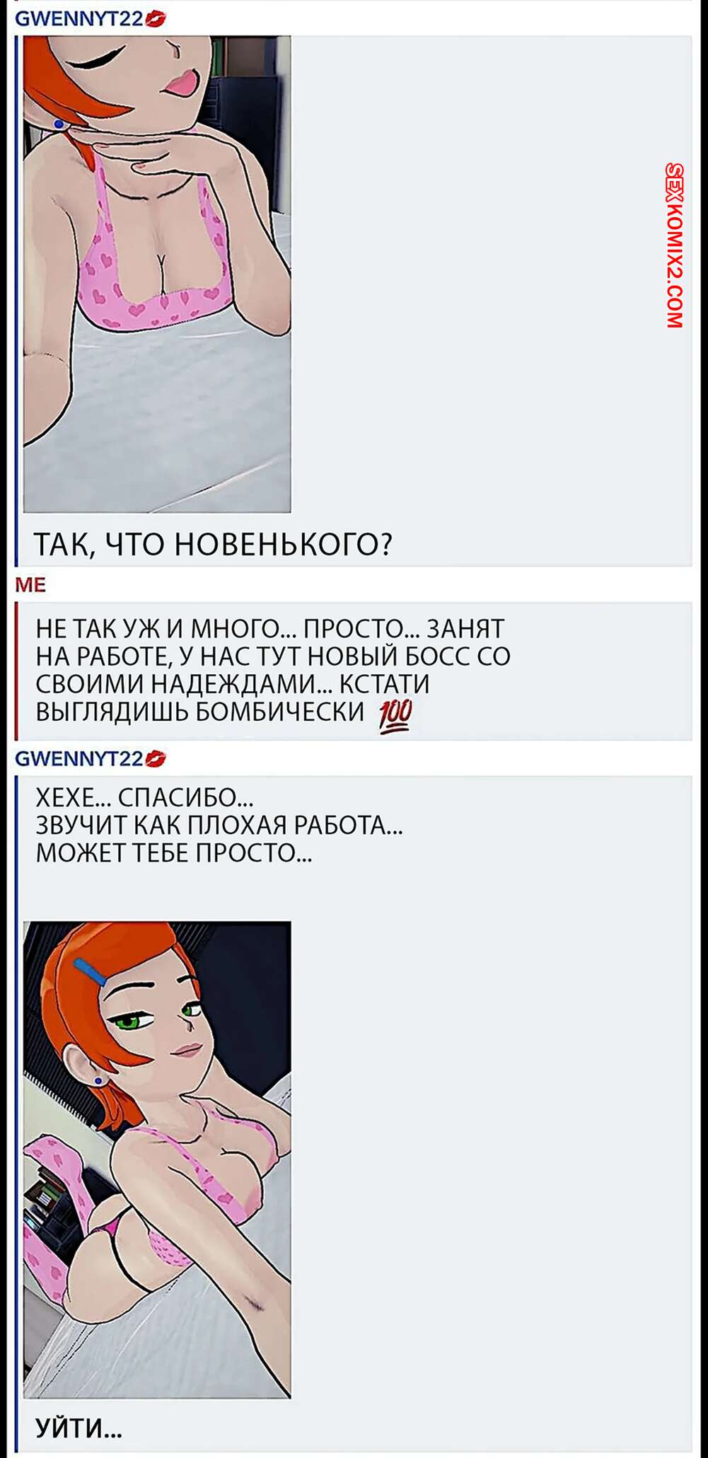 Порно комикс Бен 10. Гвен присылает тебе снимки. Часть 2. Gwen sends you snaps. Breakwater ridge Горячая рыжая красотка Гвен была очень возбуждена и решила повеселиться со своим дружком. Она разделась и стала отправлять своему дружку откровенные фотографии, наслаждаясь этим.