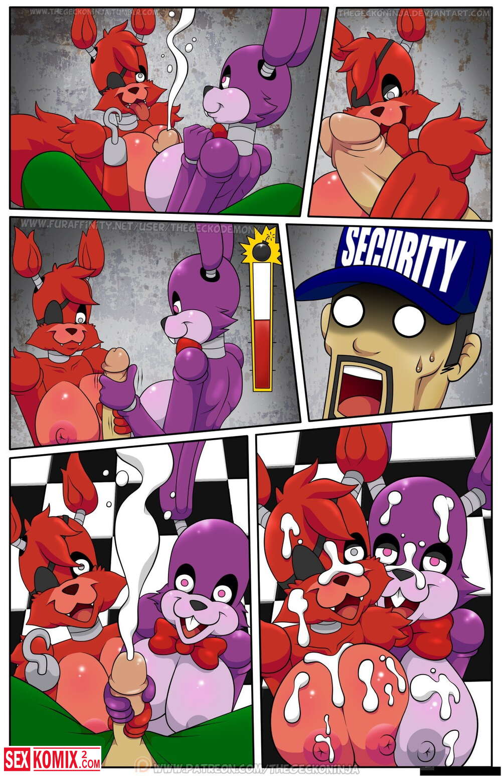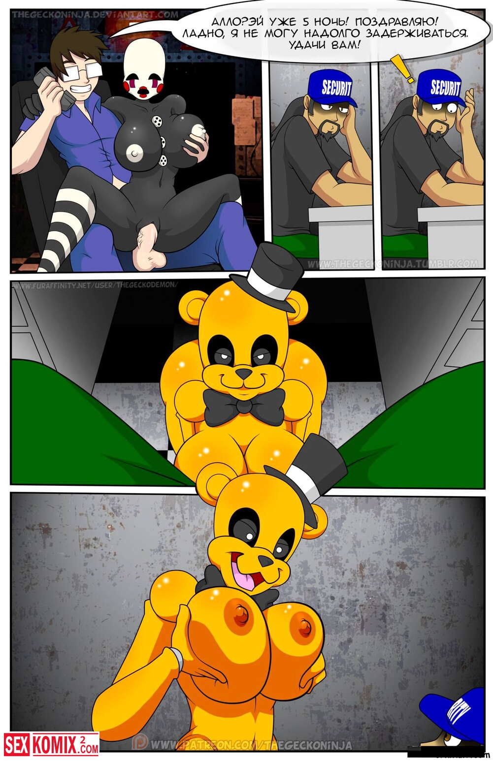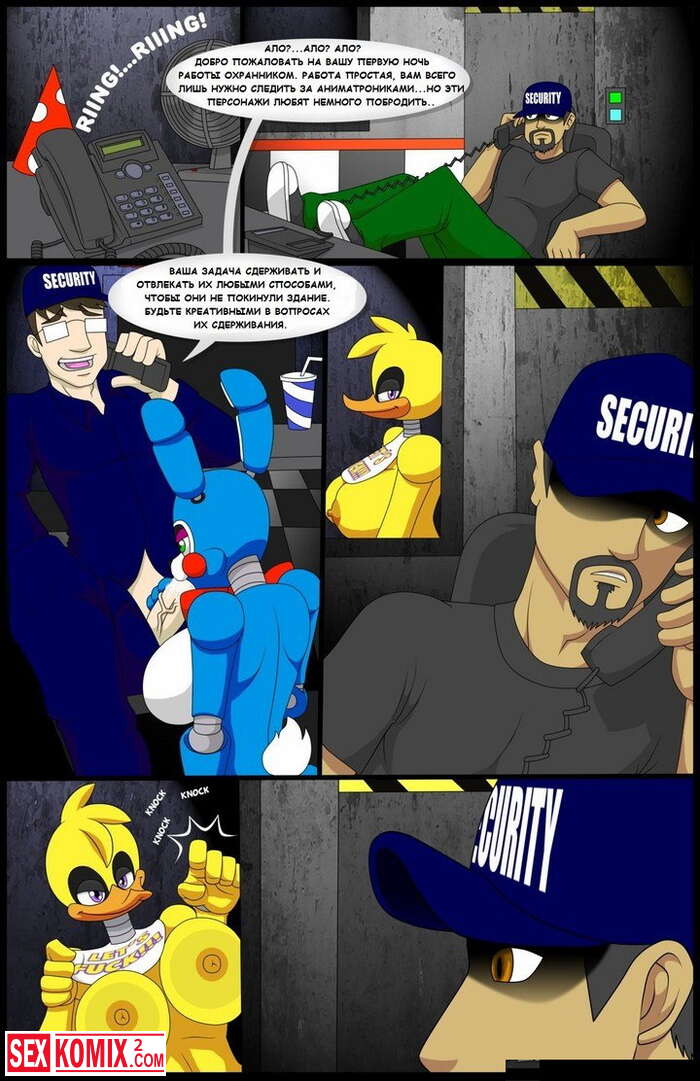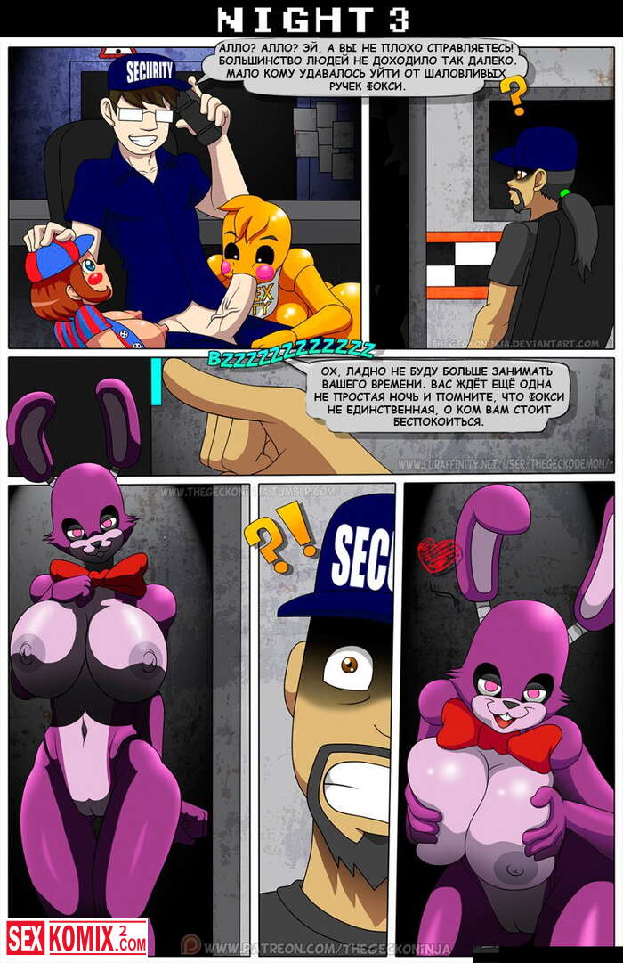 Порно комикс Пять ночей с Фредди. По мотивом одноименно игры, парень остается на ночь с озабоченными фурри куклами и нужно удовлетворять их и так все 5 ночей.