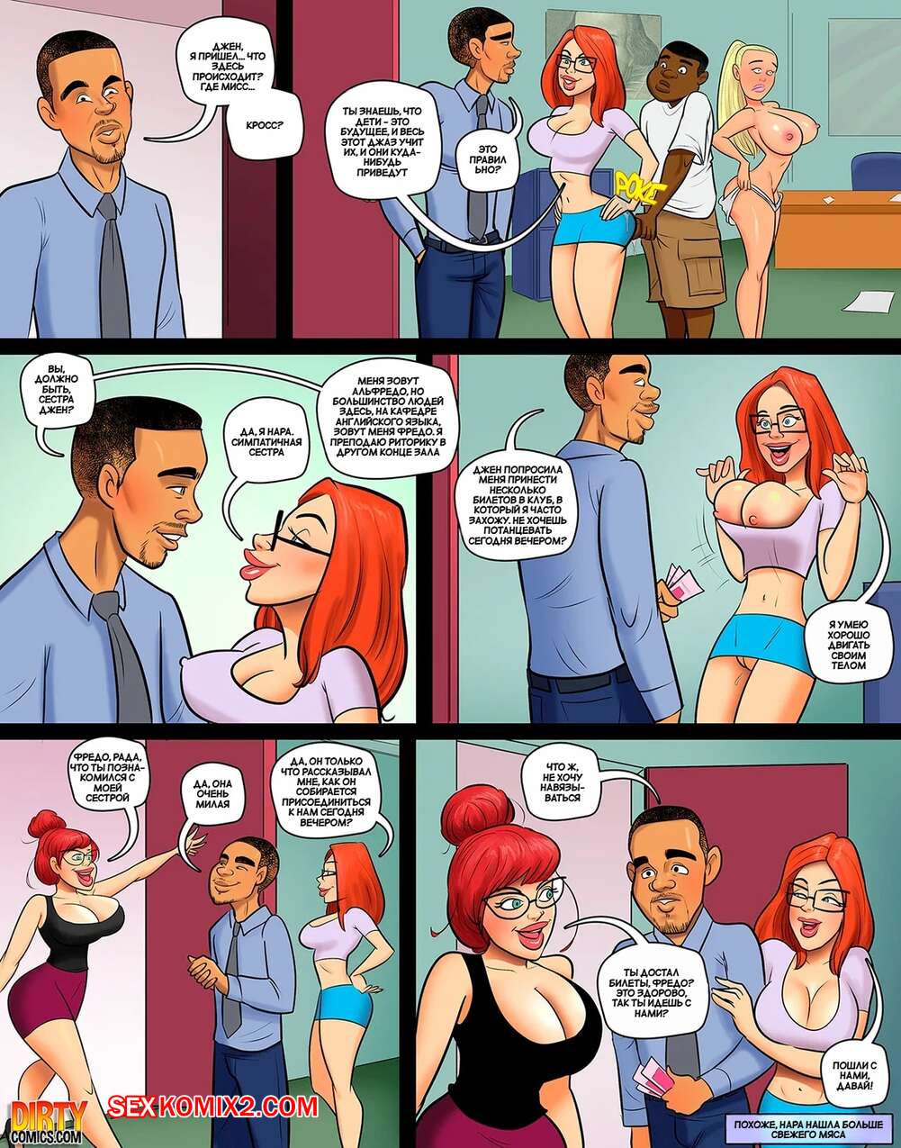 Порно комикс Горячо для миссис Кросс. Часть 5. Hot for Mrs. Cross. DirtyComics Горячие красотки стали настоящими шлюхами для молодого темнокожего парня. Они разделись и выстроились в очередь, чтобы парень выебал их задницы и кончил в них.