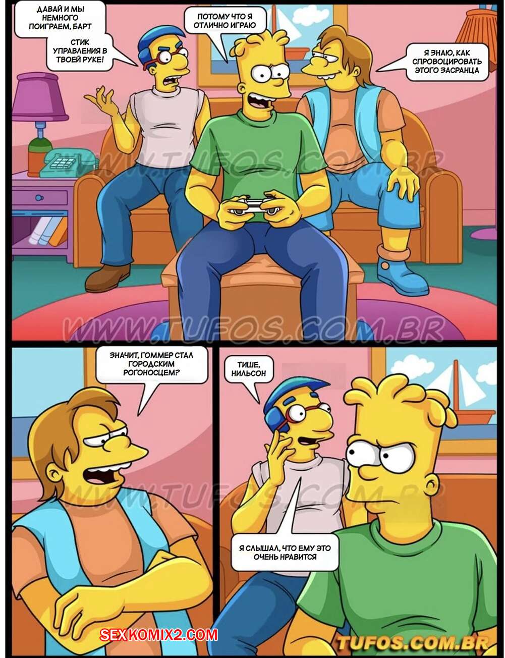 Порно комикс Симпсоны. Часть 60. День видеоигр. Os Simptoons. Tufos Барту надоело, что его друзья трахают его горячую мамку. Парень пригласил к себе домой мамок друзей и хорошенько выебал их, получив от этого огромное удовольствие.