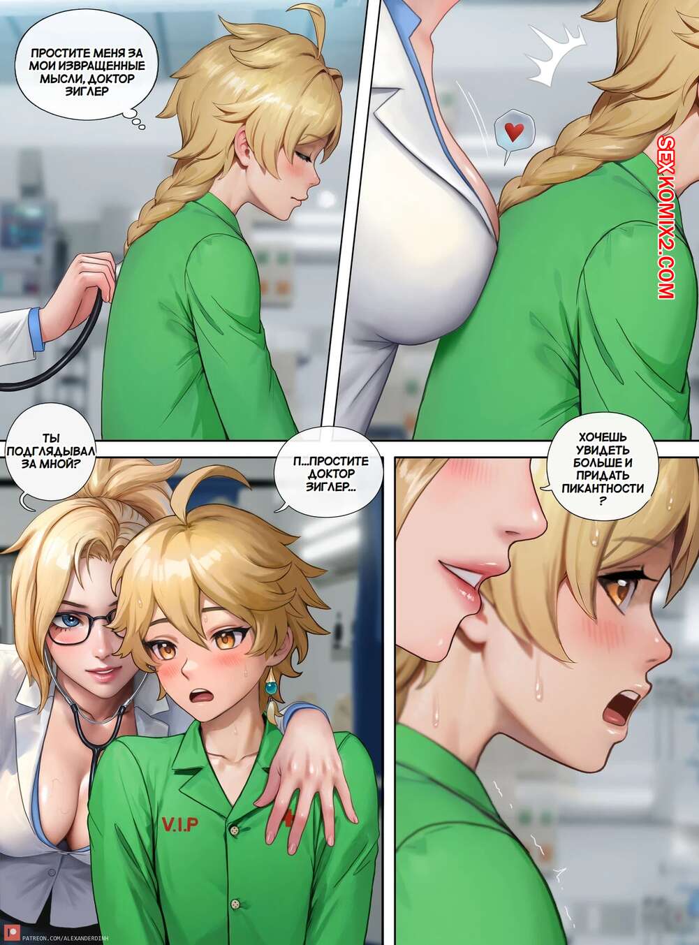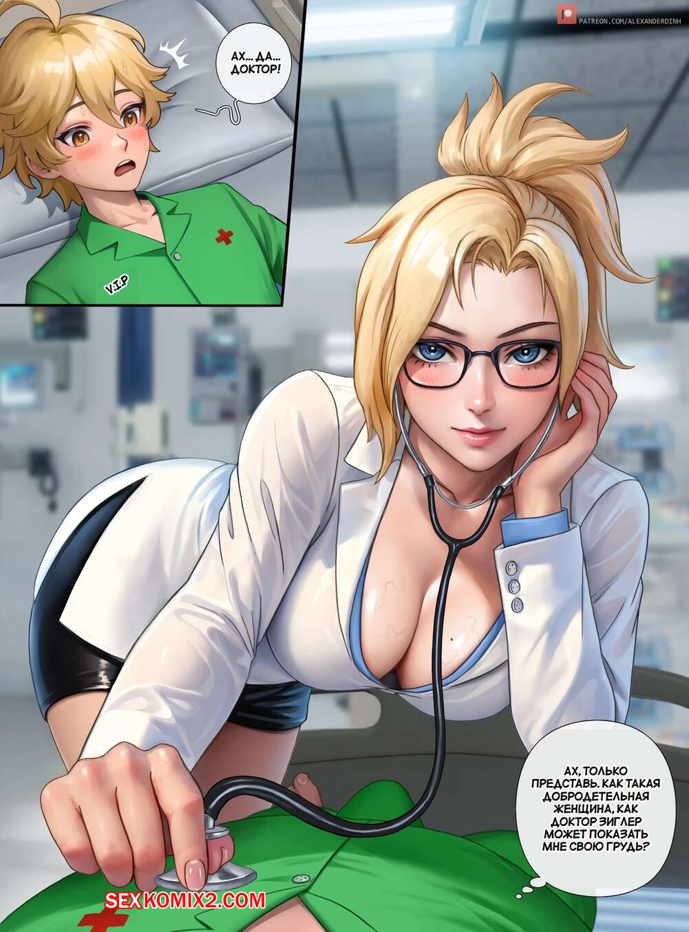 Порно комикс Лечение доктора Мерси. Dr. Mercys Treatment. Alexanderdinh. Горячие красотки ухаживают за молодым парнем в больнице и без ума от его большого члена. Девушки раздеваются и сосут хуй парня, после чего дают ему себя выебать и кончить в них.