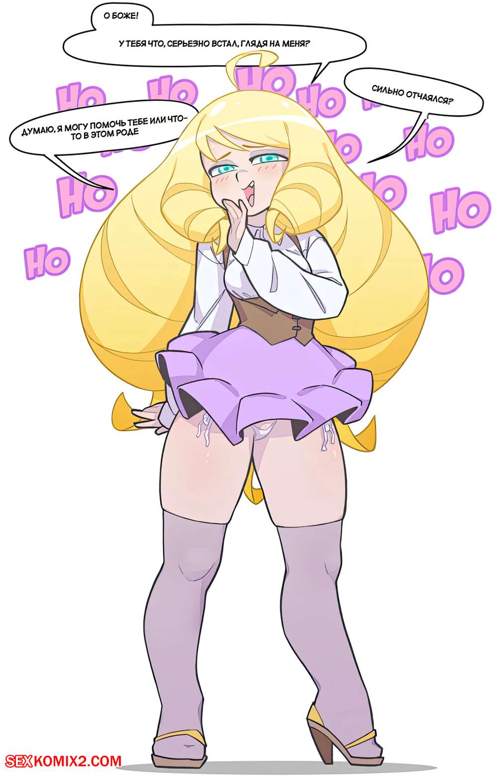 Порно комикс Оджоусама. Ojousama. Pink Pirate. Горячая блондинка надела сексуальный наряд и отправилась на встречу со своим дружком. Увидев девушку, он сразу возбудился, а у красотки стала покалывать киска при виде твердого члена парня.