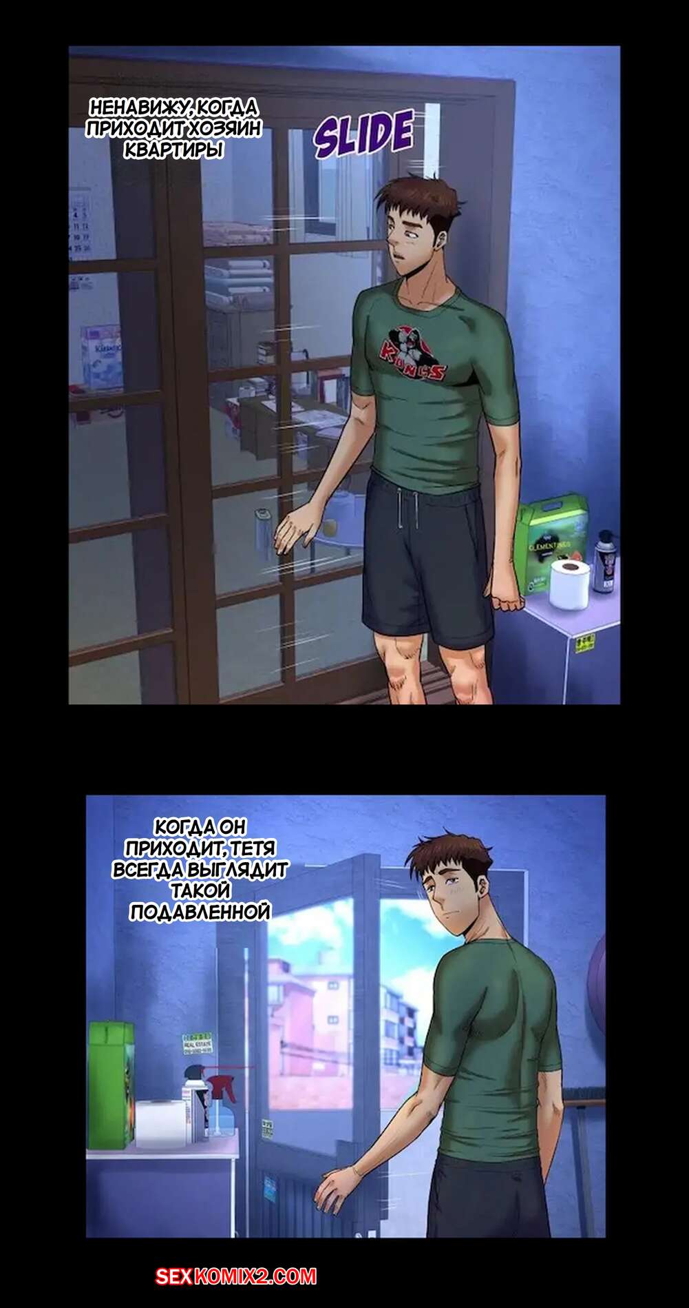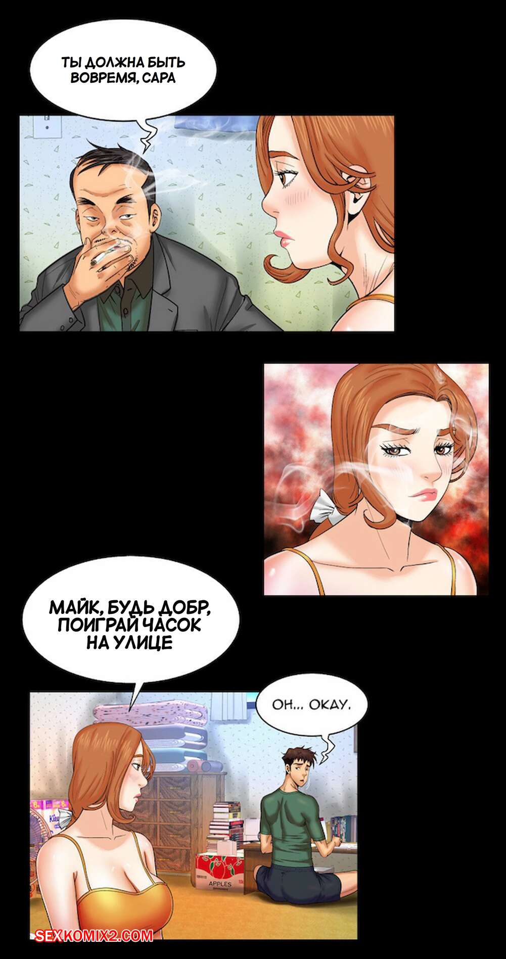 Порно комикс Моя тетя. Без цензуры. Часть 11. My Aunt. Toomics Горячая брюнетка милфа была уже готова вставить в себя большой член молодого парня, но ей помешал это сделать муж. Он принес женщине сексуальный наряд, после чего стал лизать ее пизденку.