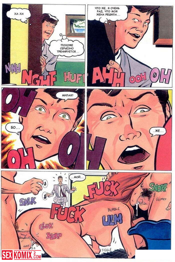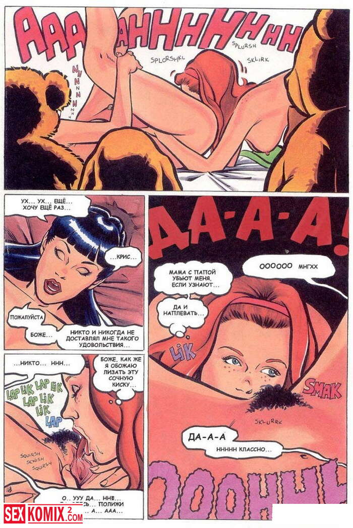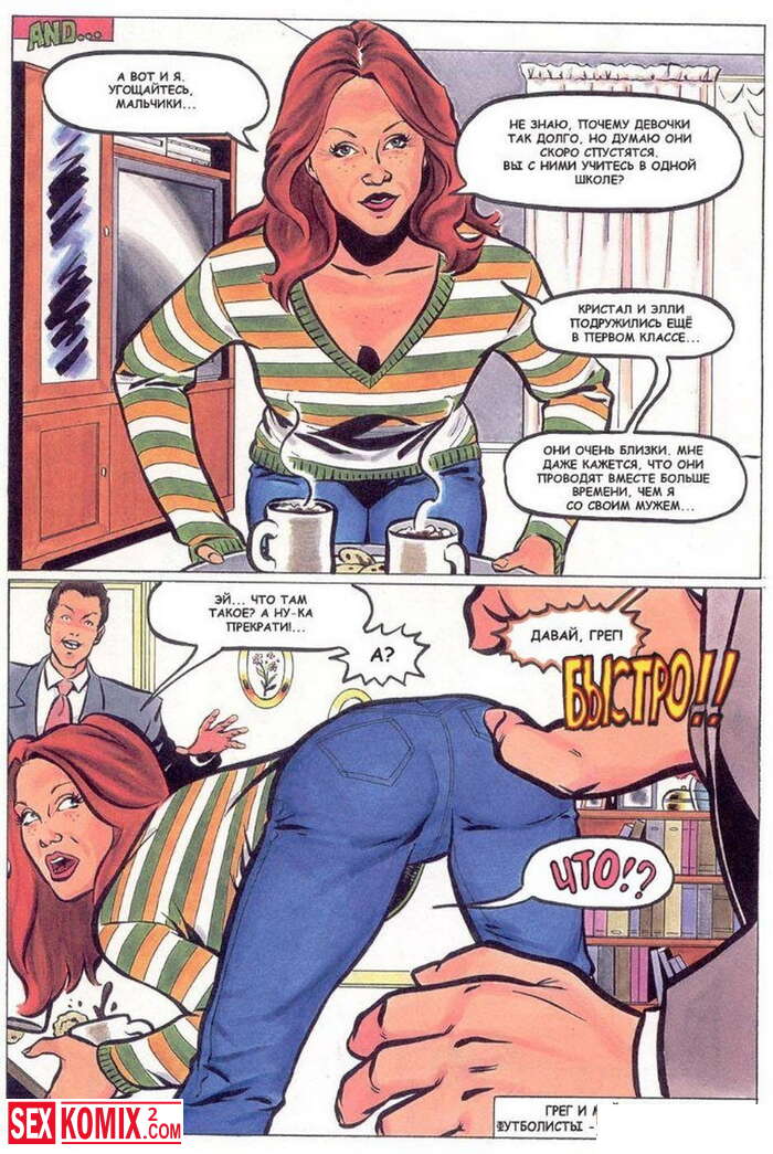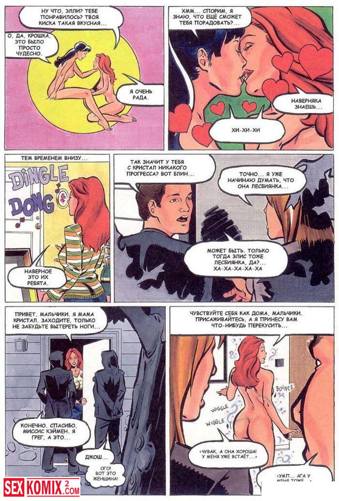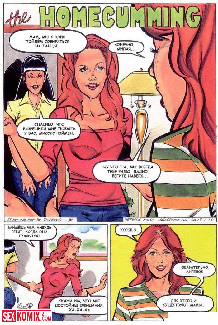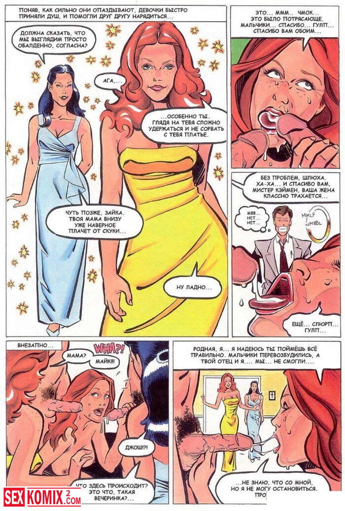 Порно комикс Горячие мамки. Развратные домохозяйки связали мужа одной из них и начали ласкать себя у него на глазах. А потом пришли двое парней и трахали женщин пока муж смотрел.