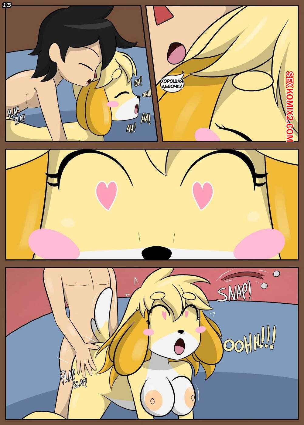 Порно комикс Animal crossing. Разворачивая Изабель. Unwrapping Isabel Горячая блондинка Изабель была очень возбуждена и решила повеселиться со своим дружком. Девушка разделась и отсосала большой хуй парня, после чего дала ему себя выебать.
