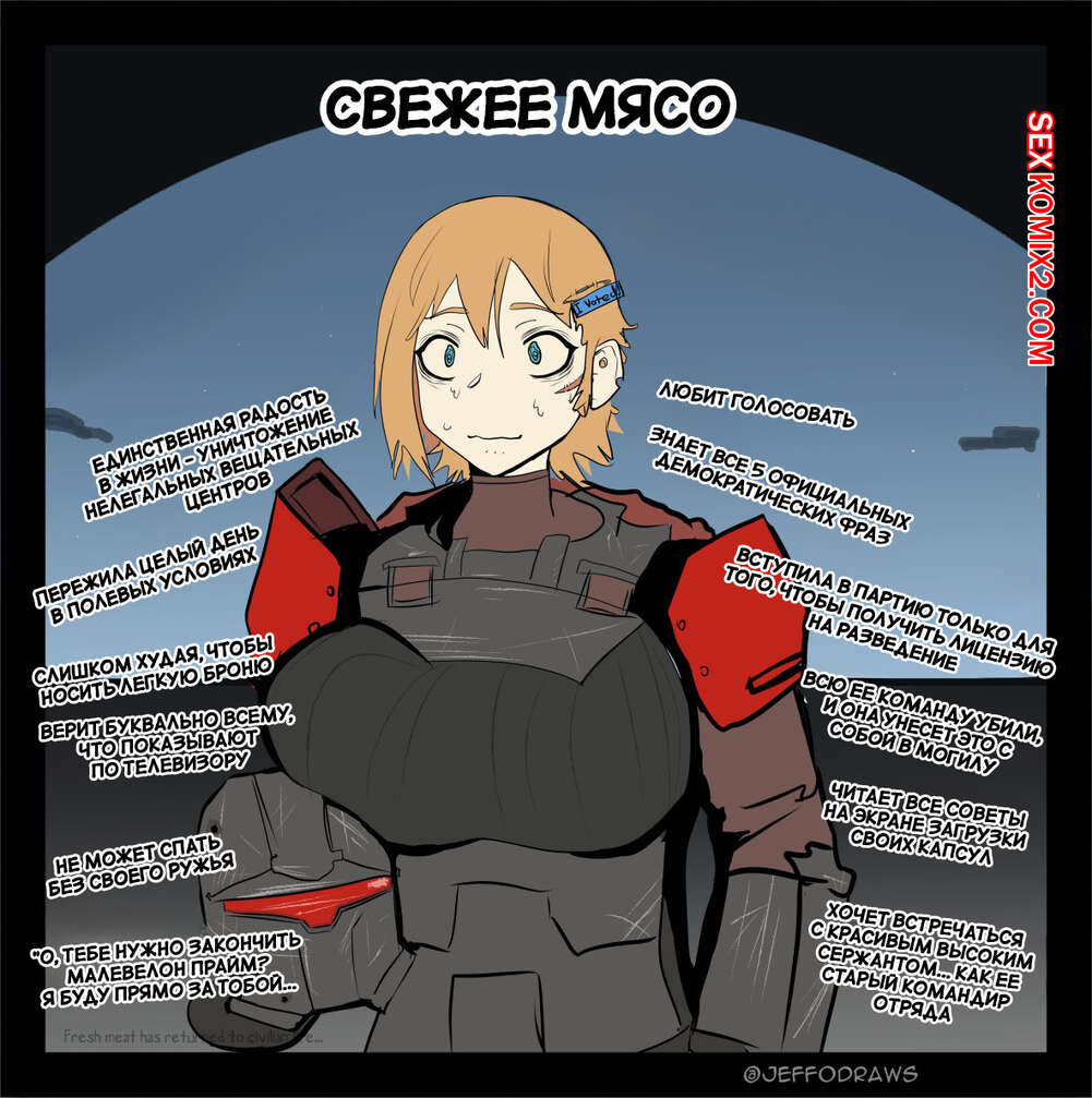 Порно комикс Helldivers 2. Подруга из свежего мяса. Fresh Meat GF. Jeffodraws Горячая блондинка является воительницей и любит вступать в битвы. Несмотря на свои увлечения, красотка обладает шикарным телом, которое не стесняется демонстрировать во всей красе.
