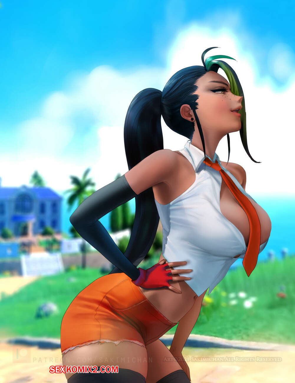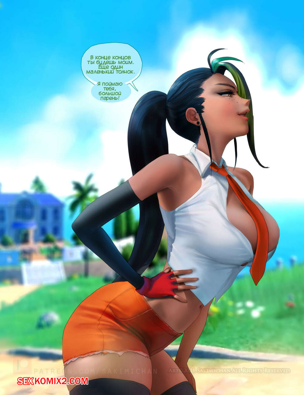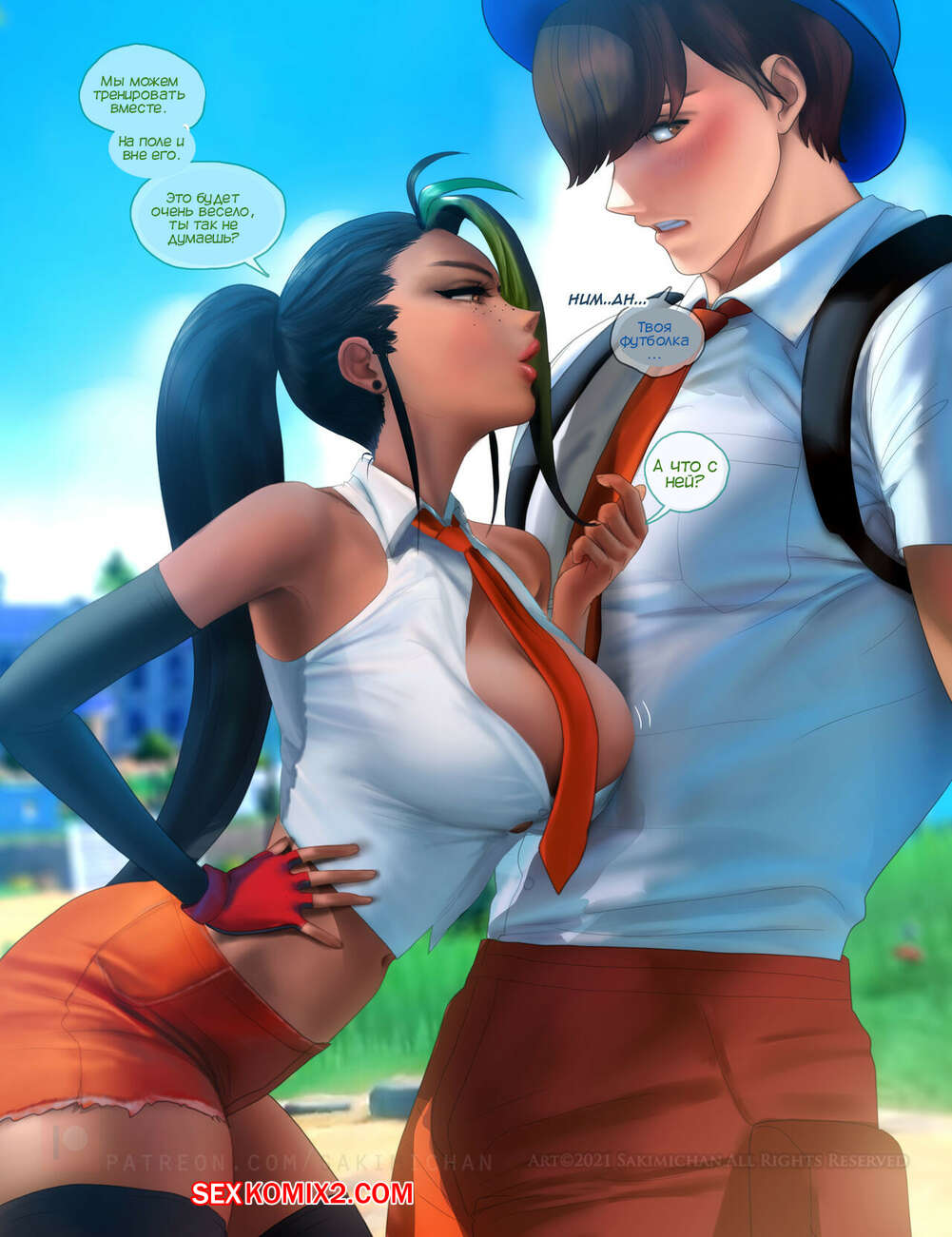Порно комикс Покемон. Pokemon. Sakimichan Горячая красотка Немона была очень возбуждена и стала соблазнять парня, желая потрахаться. Девушка встала на колени и отсосала большой хуй своего дружка, после чего он ее выебал и кончил в пизденку девушки.