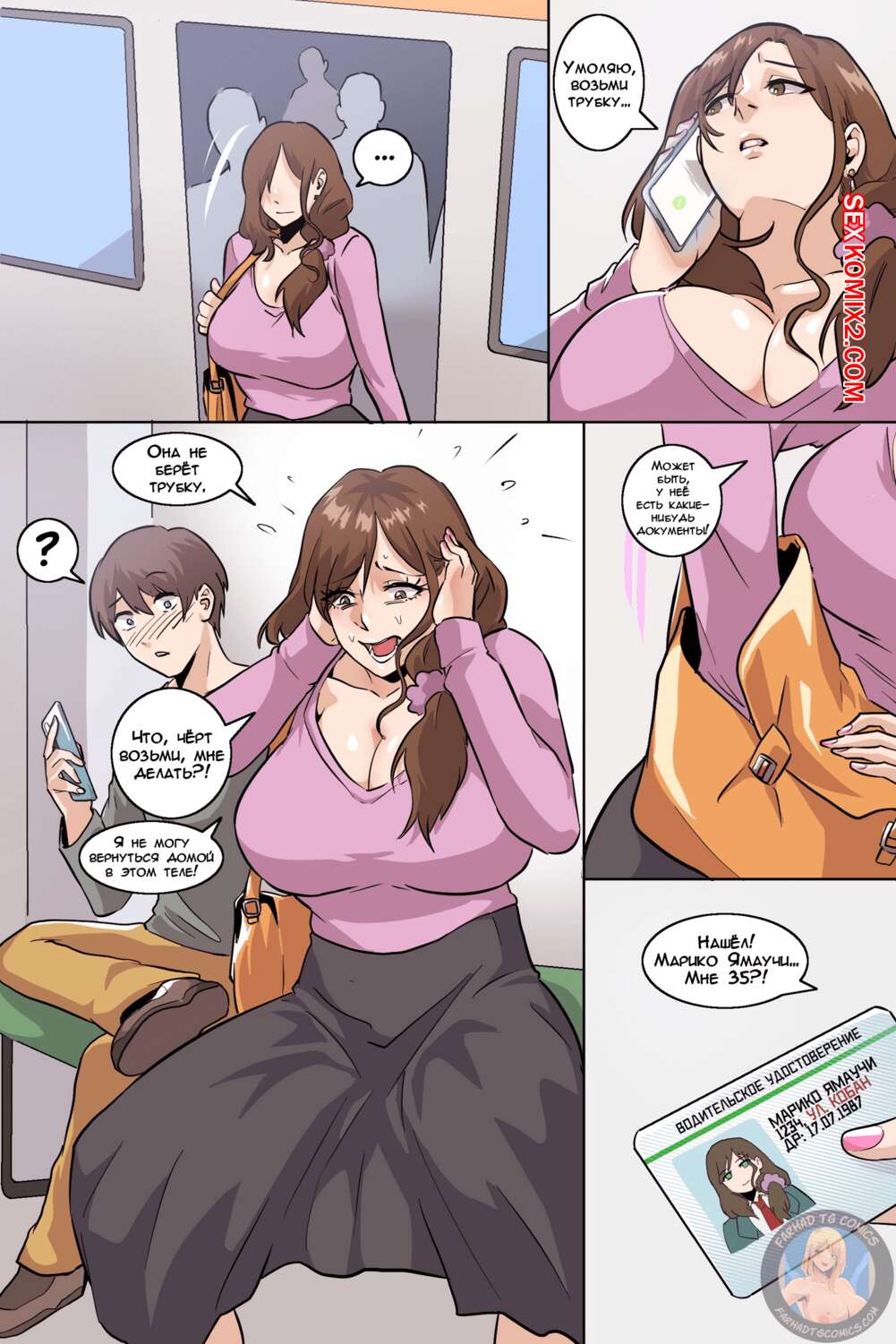 Порно комикс Внезапный обмен. Часть 1 и 2. Instant Exchange. Ernez Парень встретил горячую брюнетку милфу и пожелал оказаться в ее теле. В итоге желание парня исполнилось, и теперь он в своем новом обличии веселится с девушкой, застравшей в его теле.