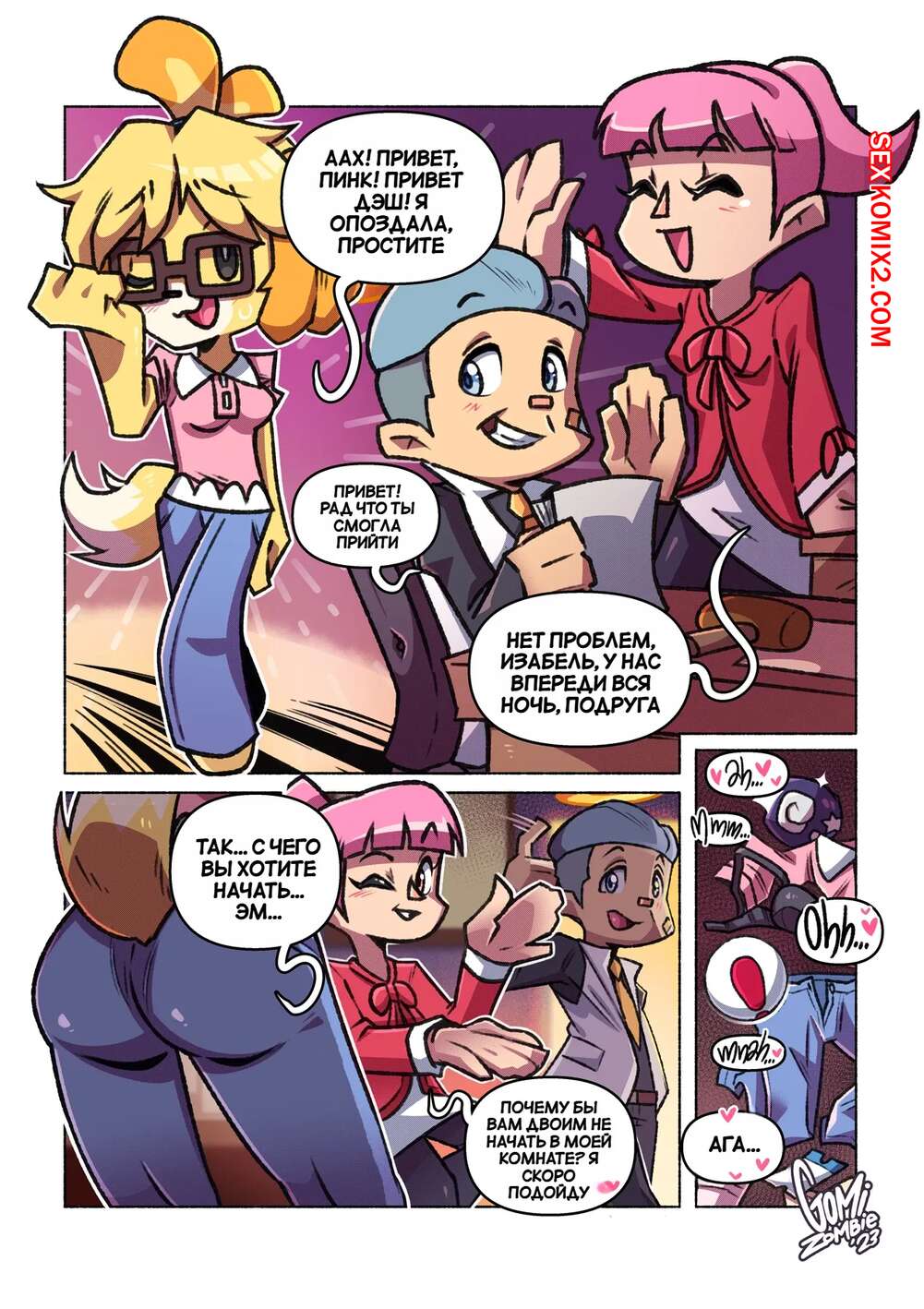 Порно комикс Animal Crossing. Пересечение животных. SkaJrZombie. Горячие подруги были очень возбуждены и решили повеселиться со своим дружком. Девушки разделись и отсосали большой хуй парня, после чего дали ему себя хорошенько выебать.