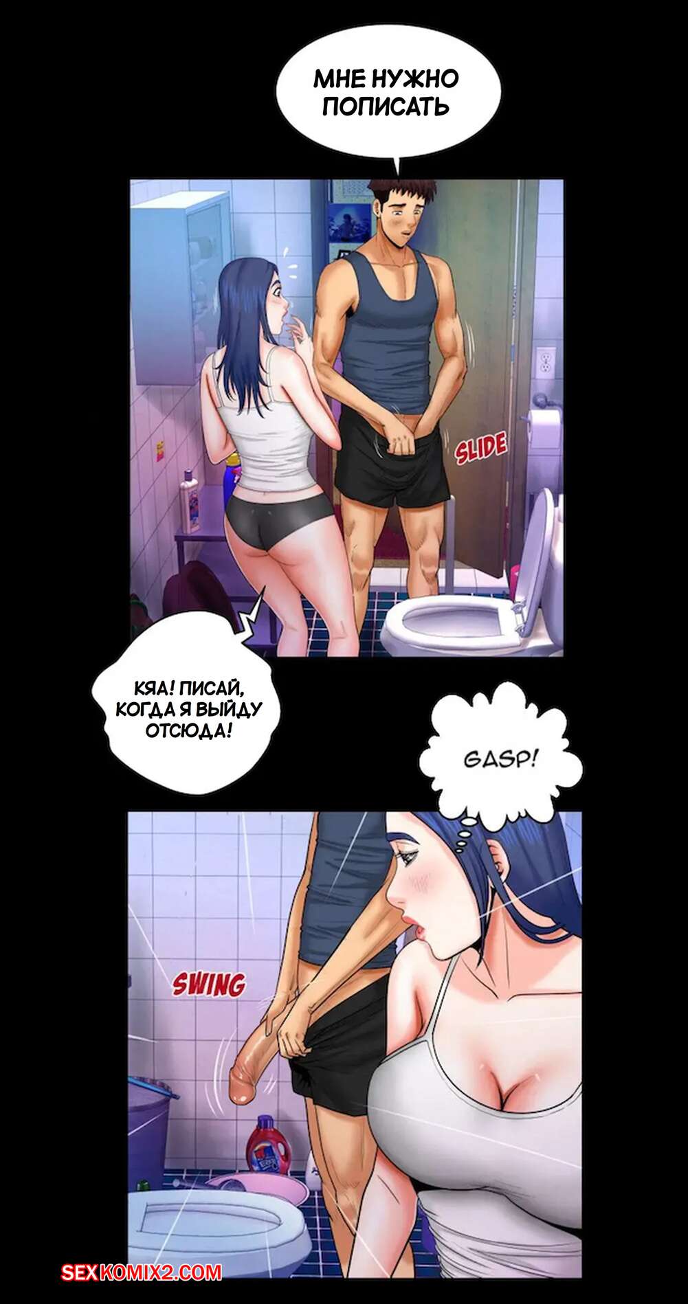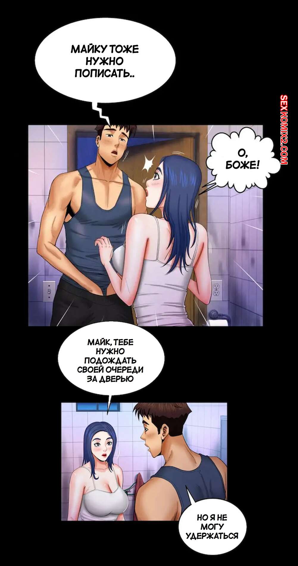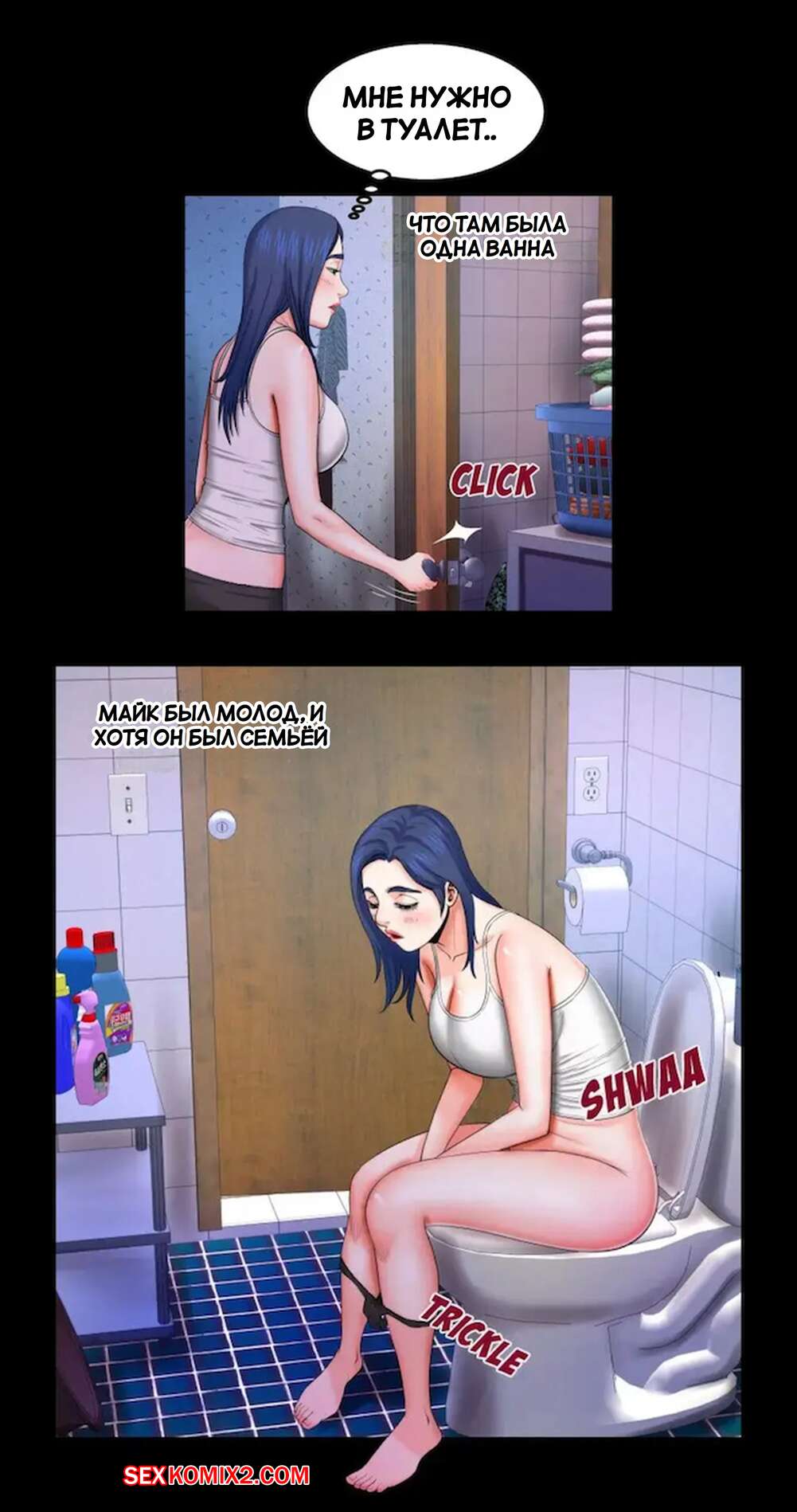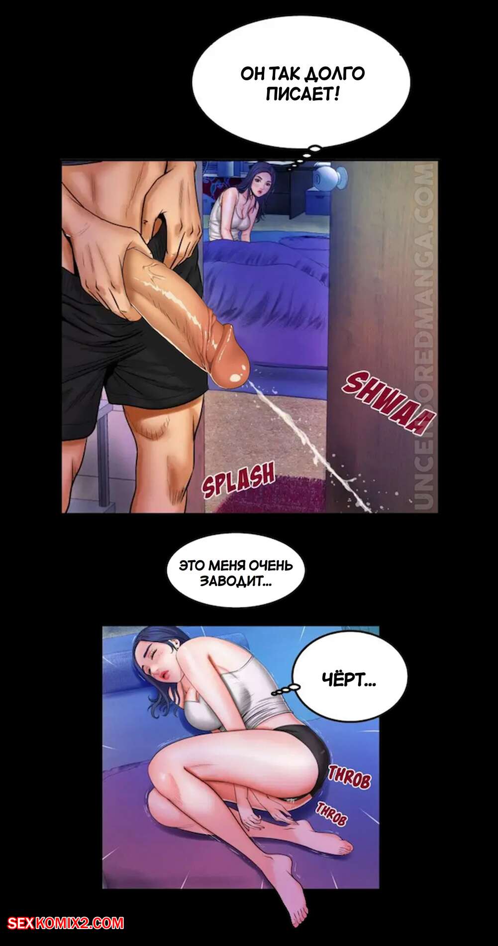 Порно комикс Моя тетя. Без цензуры. Часть 18. My Aunt. Toomics Горячая сисястая брюнетка застала парня в туалете и возбудилась, увидев его огромный член. Девушка легла спать и стала ласкать себя, представляя секс со своим дружком.