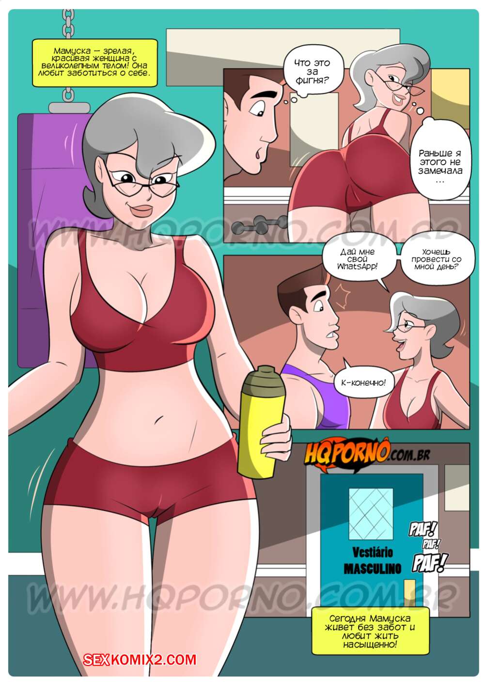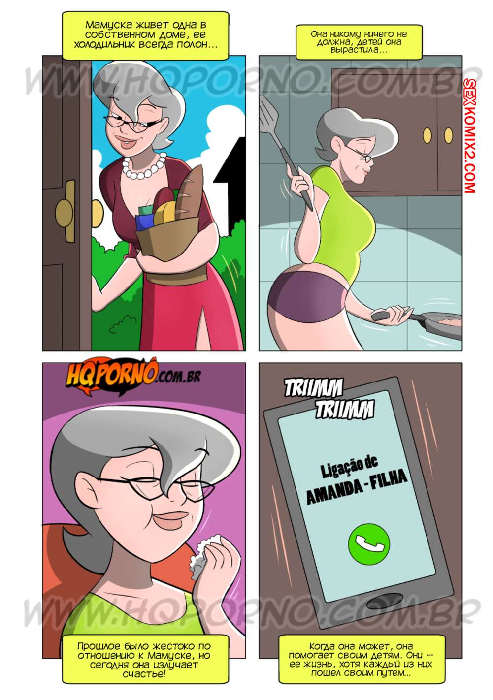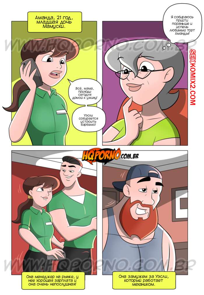 Порно комикс Мамуска, возбужденная свекровь. Часть 1. Неожиданный визит. HQPorno Горячая милфа Мамуска живет свободной счастливой жизнью. Она привлекает молодых парней и трахается с ними. Мамочку пригласила к себе на барбекю дочь, но когда милфа пришла домой к дочери, она застала ее мужа за еблей с горничной.