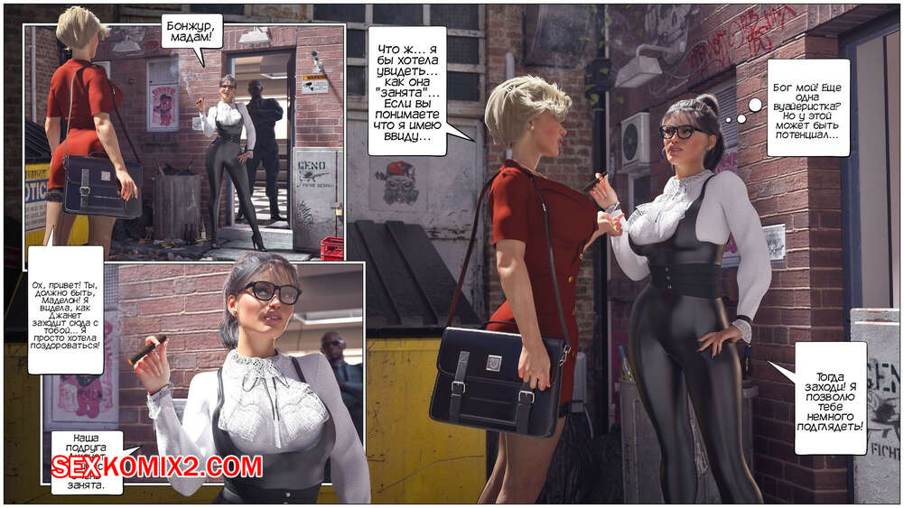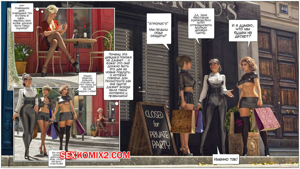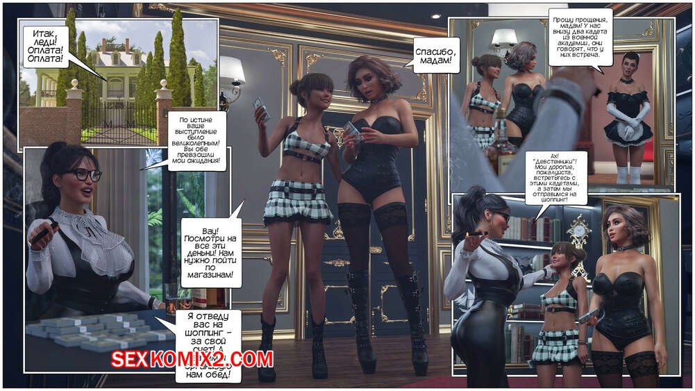Порно комикс Дом мадам Маделон. Часть 3. The House of Madam Madelon. Tab109 Лана и Джанет собирались отправиться по магазинам вместе с мадам Маделон, но сперва им нужно провести встречу с двумя кадетами. Парни пришли, чтобы наконец лишиться девственности, и две подруги шлюшки готовы им помочь.