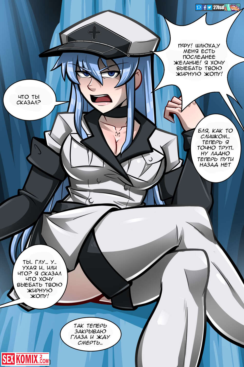 Порно комикс Акаме Akame Ga Kill. Esdeath. Красотка с голубыми волосами, разговаривает с парнем, который хочет её трахнуть в задницу, девушка не стала ломаться и сразу ему дала.