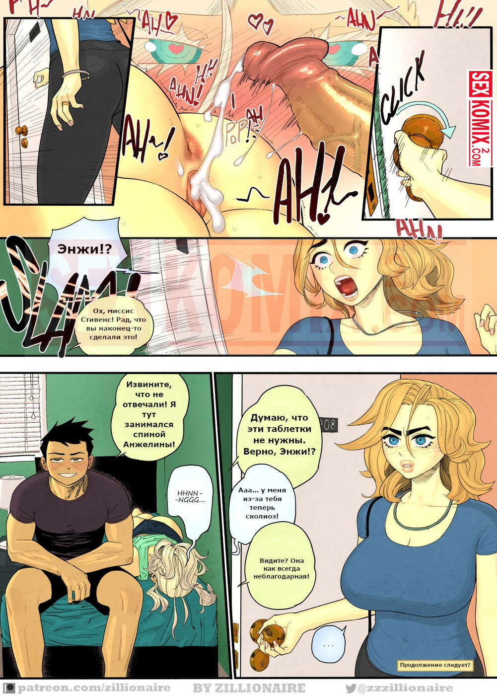 Порно комикс Поднять спиной. Zillionaire. После перетаскивания тяжелых коробок у аппетитной милфы заболела спина. Она попросила своего сына сделать её разогревающий массаж, но парень перестарался и выебал женщину.