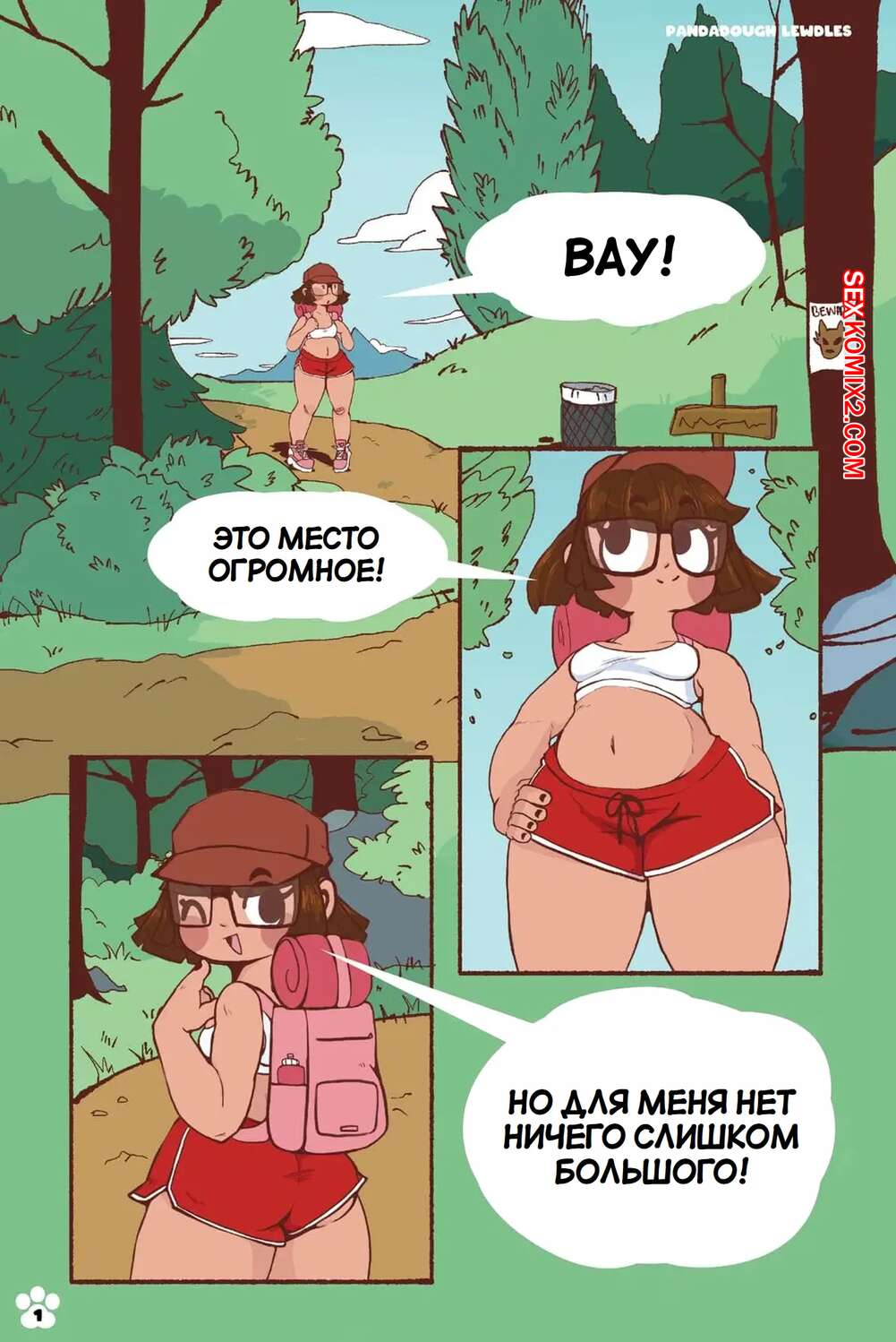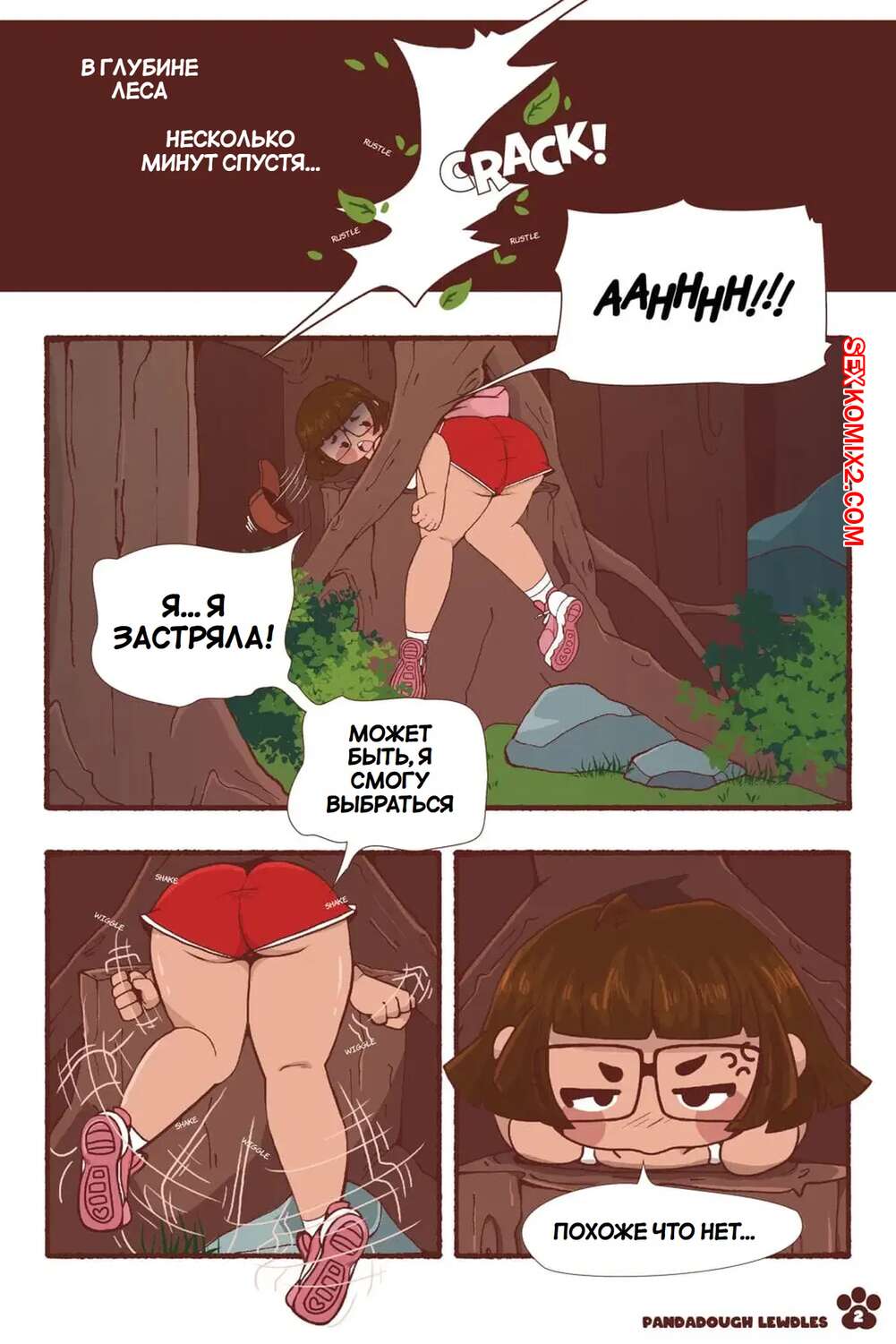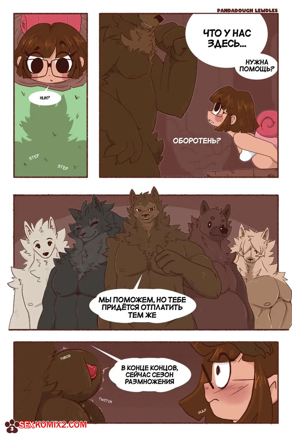 Порно комикс По звериной тропе. On The Beastly Trail. PandaDough Молодая брюнетка прогуливалась в лесу и застряла в дереве. Мимо нее проходила толпа парней медведей, которые застали беззащитную девушку и решили ее выебать.
