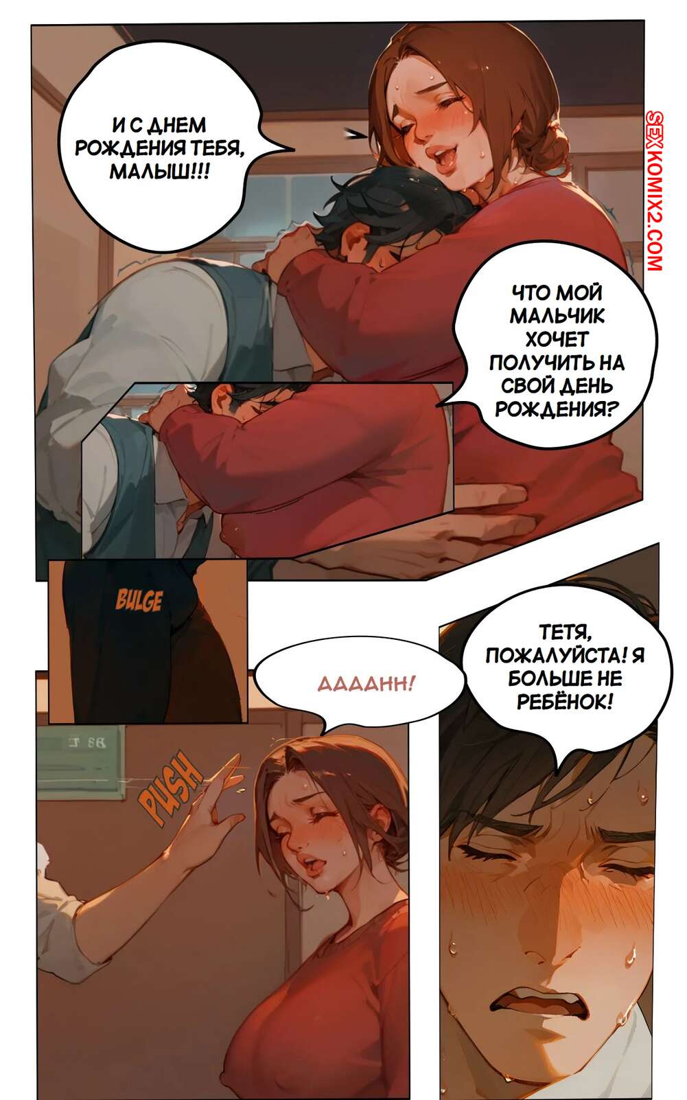 Порно комикс Подарок на день рождения тетушки. Aunties Birthday Gift. AI Generated. В день рождения женщина не ждала каких-то дорогих подарков. Но она получила очень нежный подарок от своего племянника, парень подарил ей свой хуй.