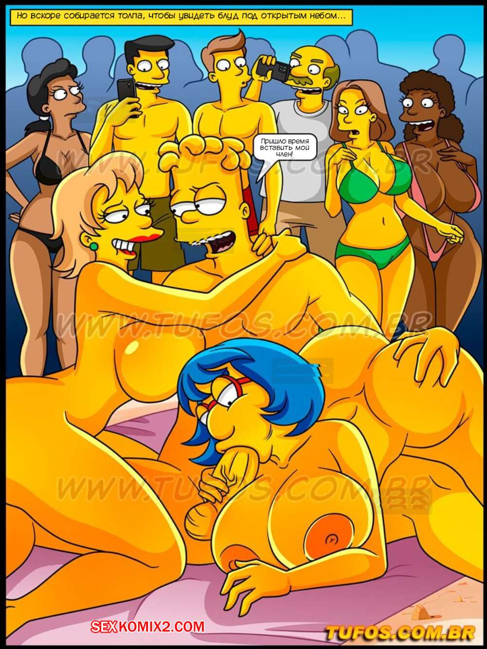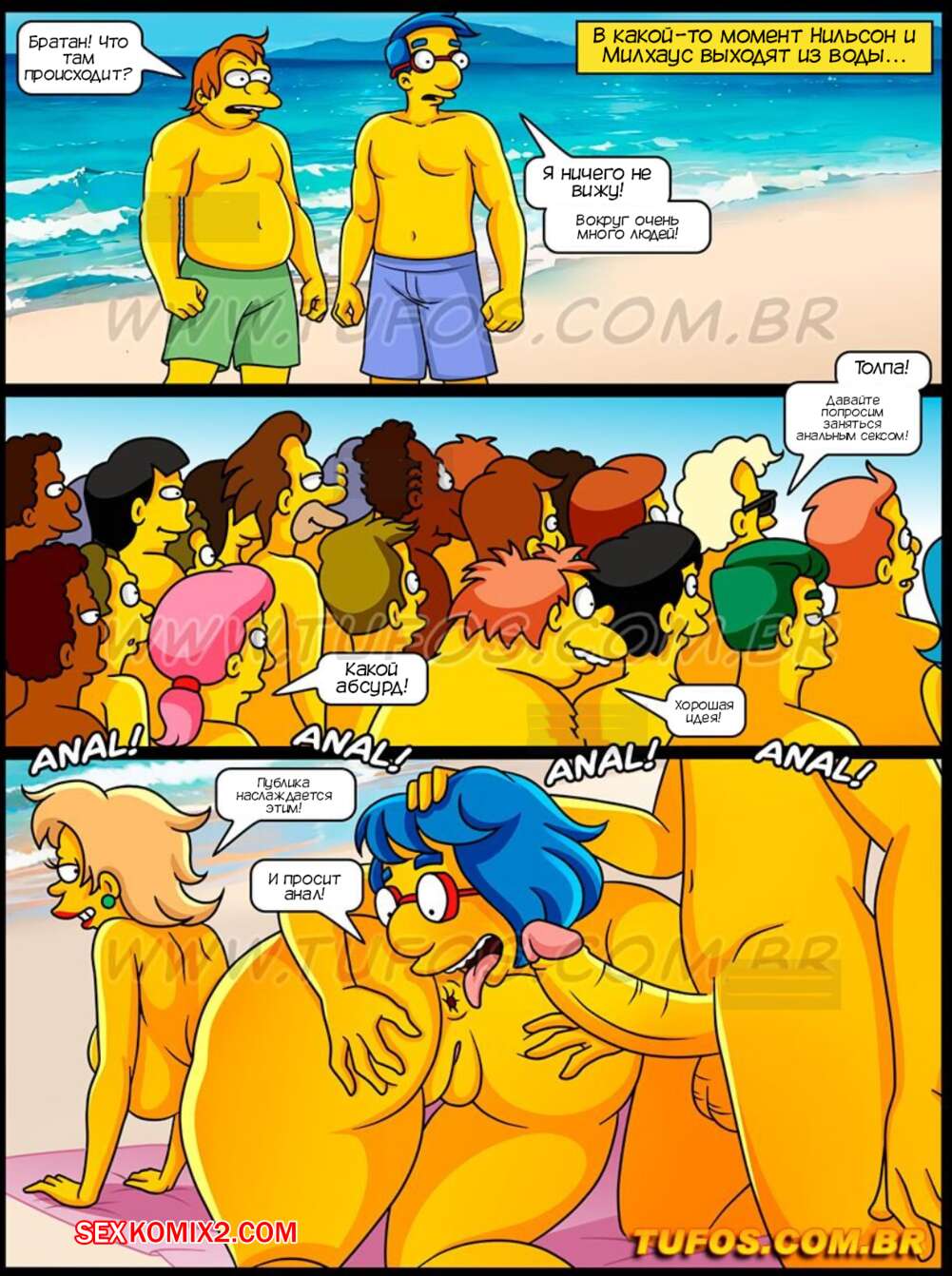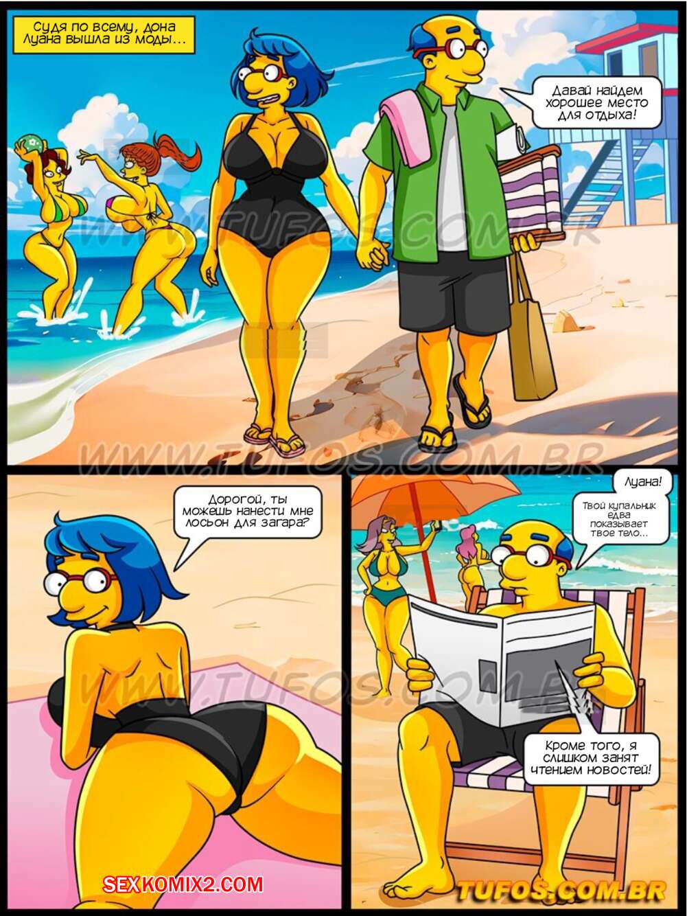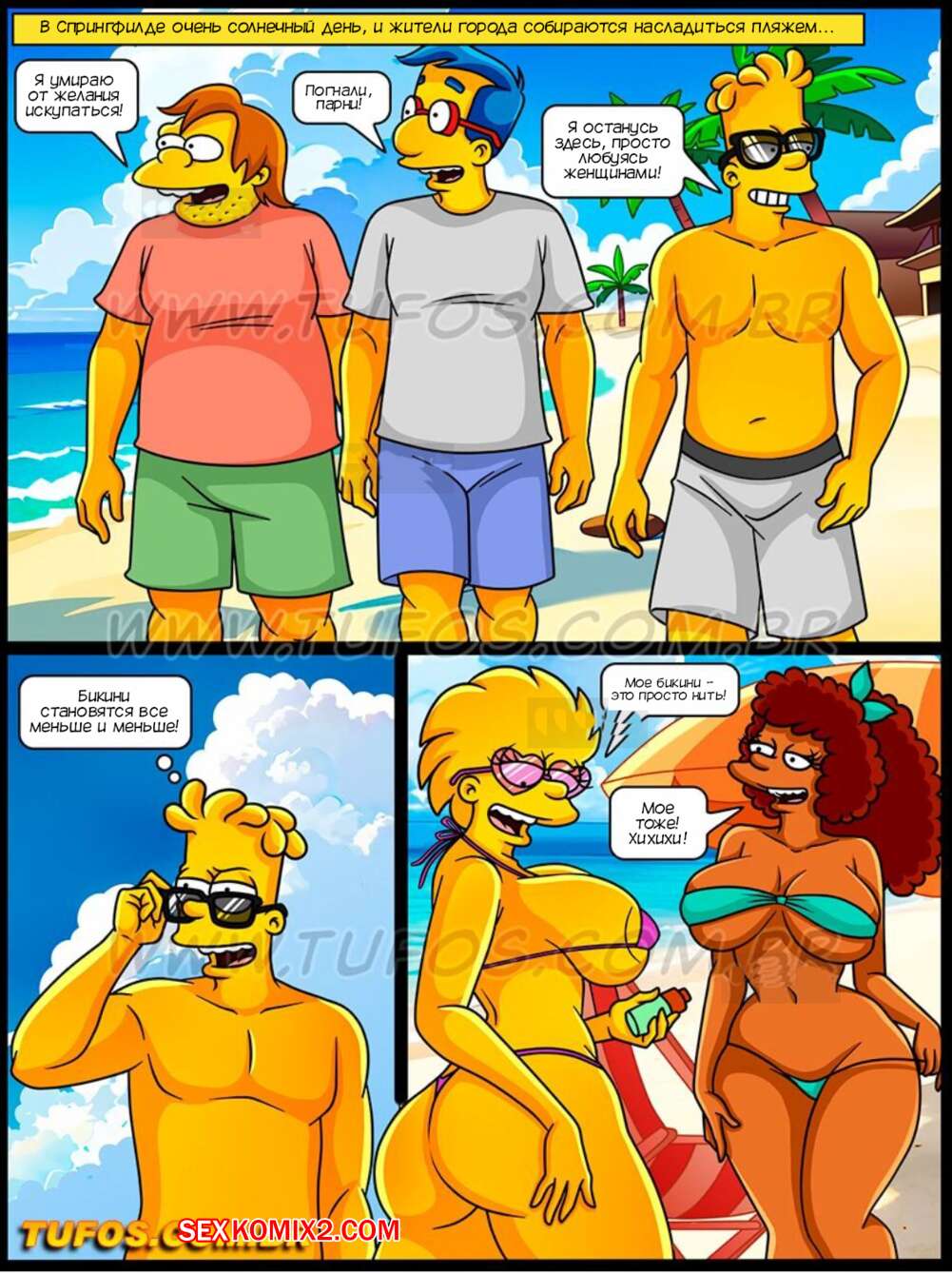 Порно комикс Симпсоны. Часть 65. Os Simptoons. Tufos Барт с отправился на пляж с Нильсоном и Милхаузом. Пока друзья пошли искупаться, Барт решил провести время с их горячими мамками. Милфы попросили парня намазать их кремом от солнца, а когда заметили стояк Барта, красотки дали ему себя выебать во все дырочки.