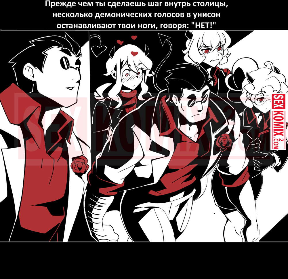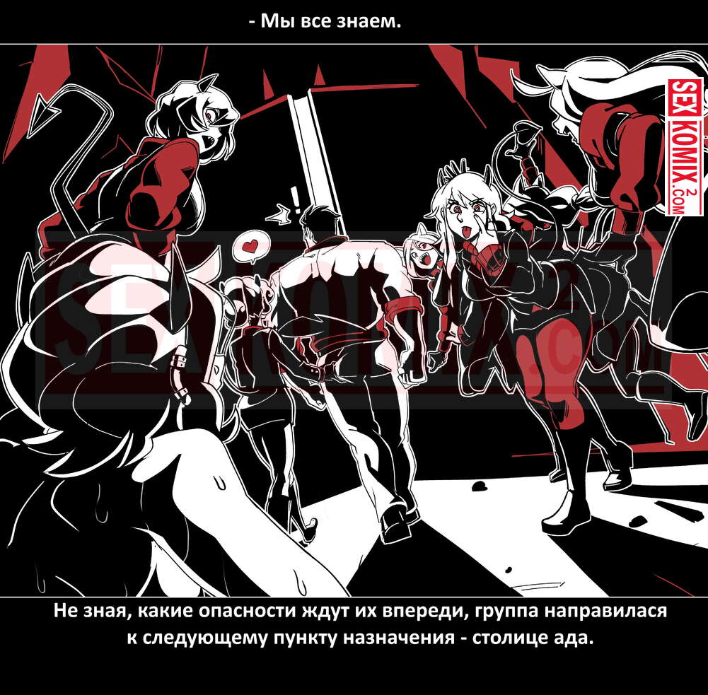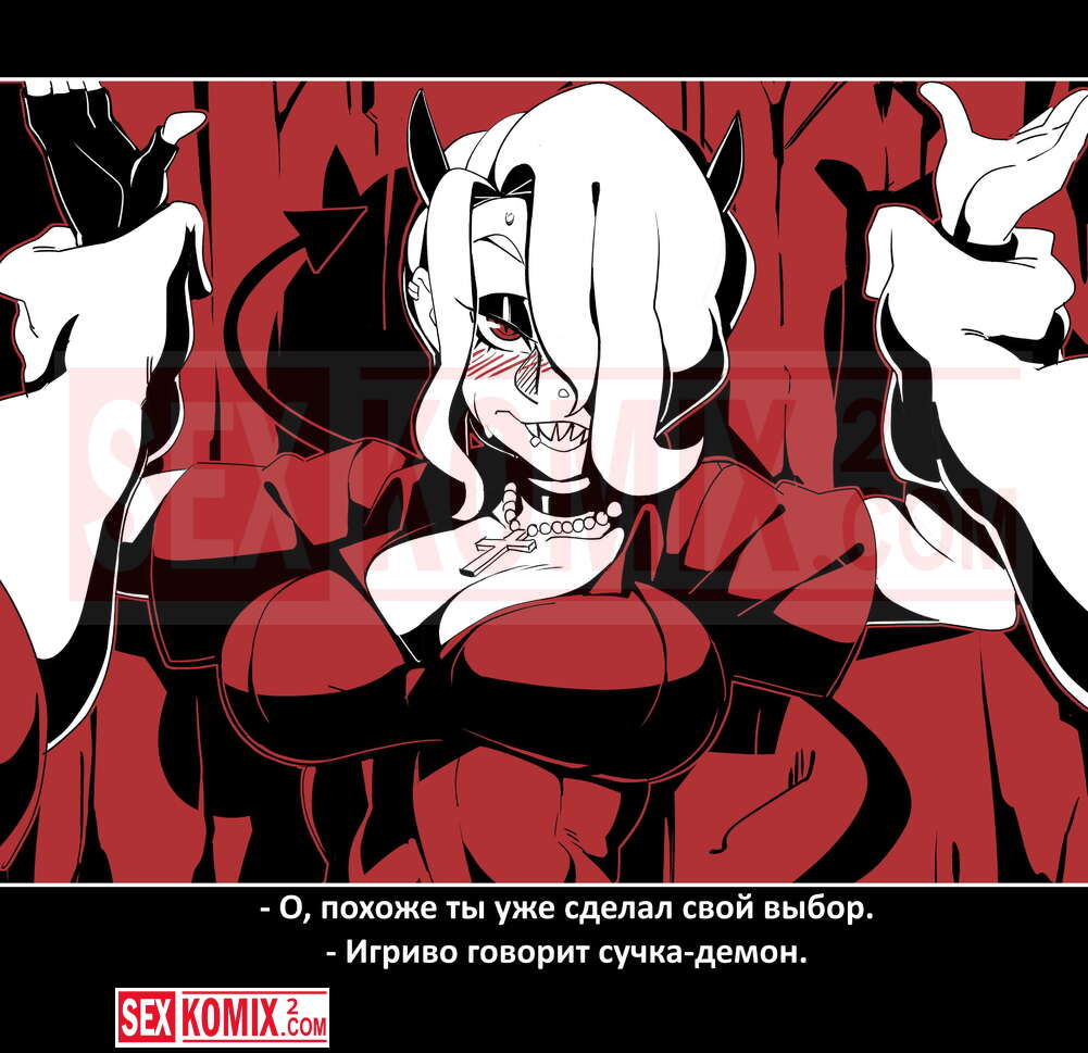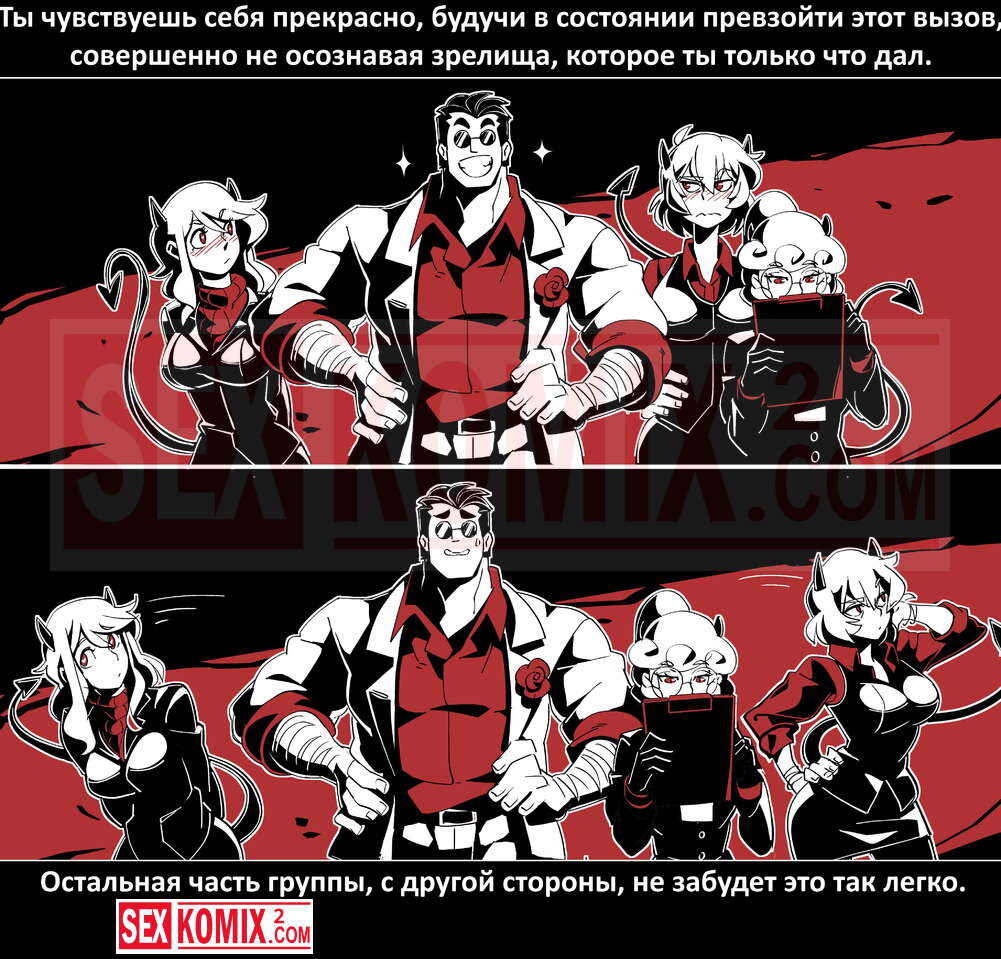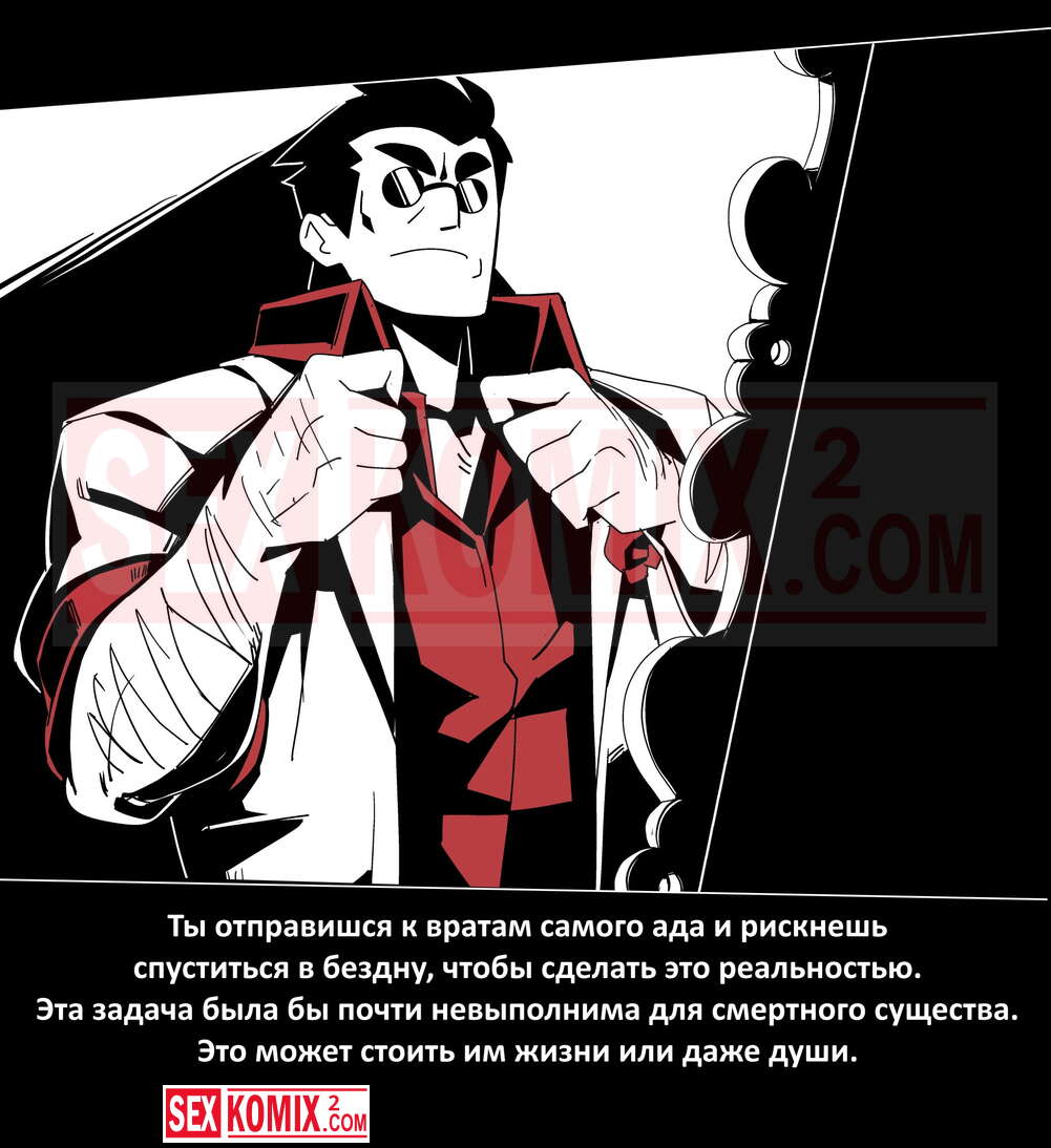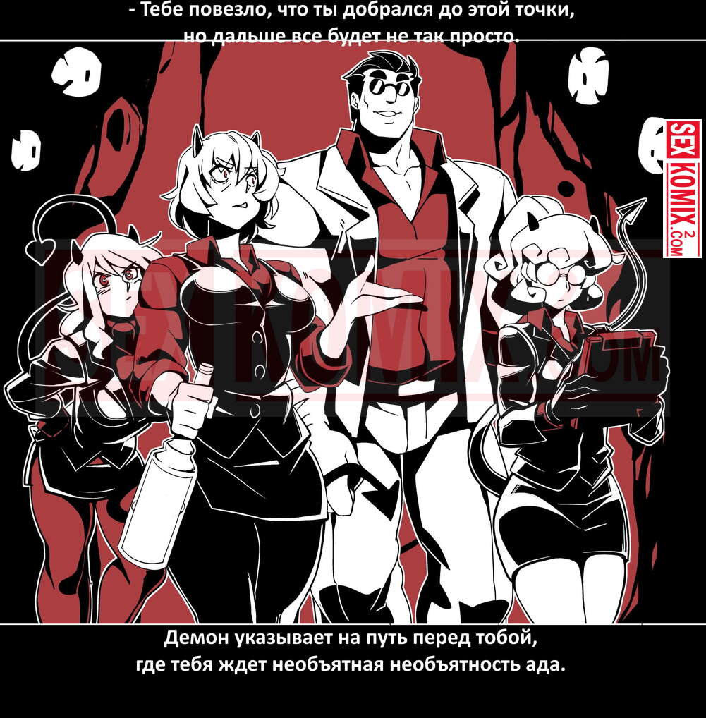 Порно комикс Безумие Хеллтакер. Helltaker. На русском. Мужчина понял, что ему перепадет отличный секс с демоническими красотками и он пошел в дорогу, на встречу опасностям, ради секса. Это похоже на какую-то игры, проходя уровни ты получаешь в награду киску горячей демоницы.