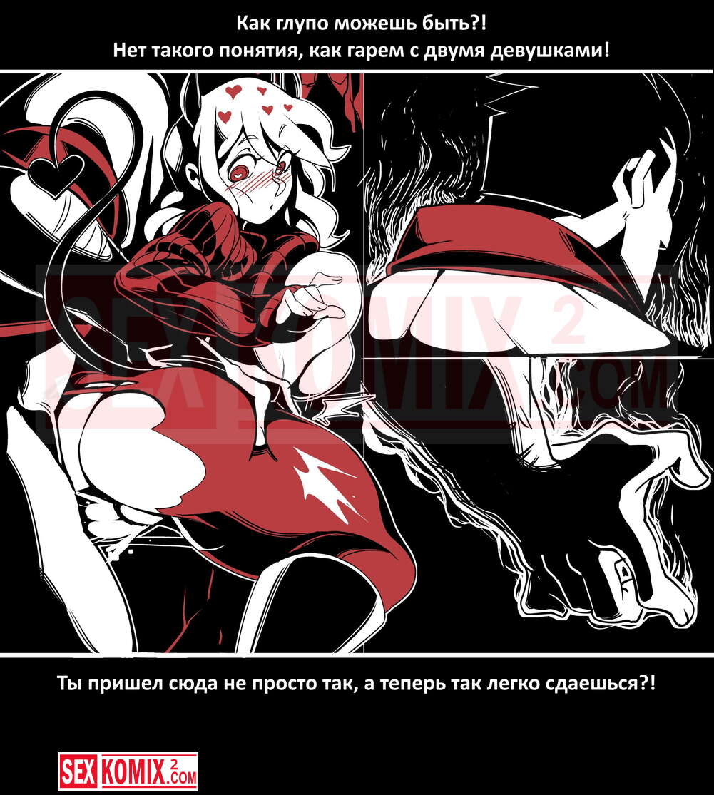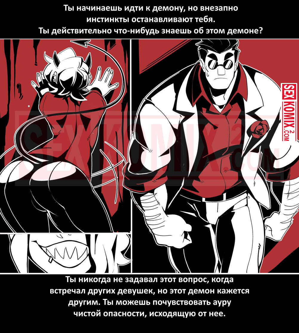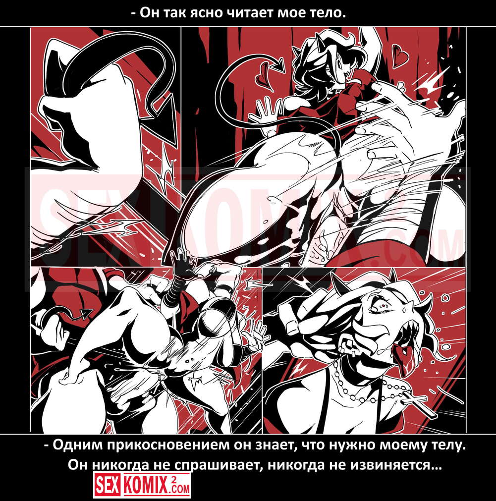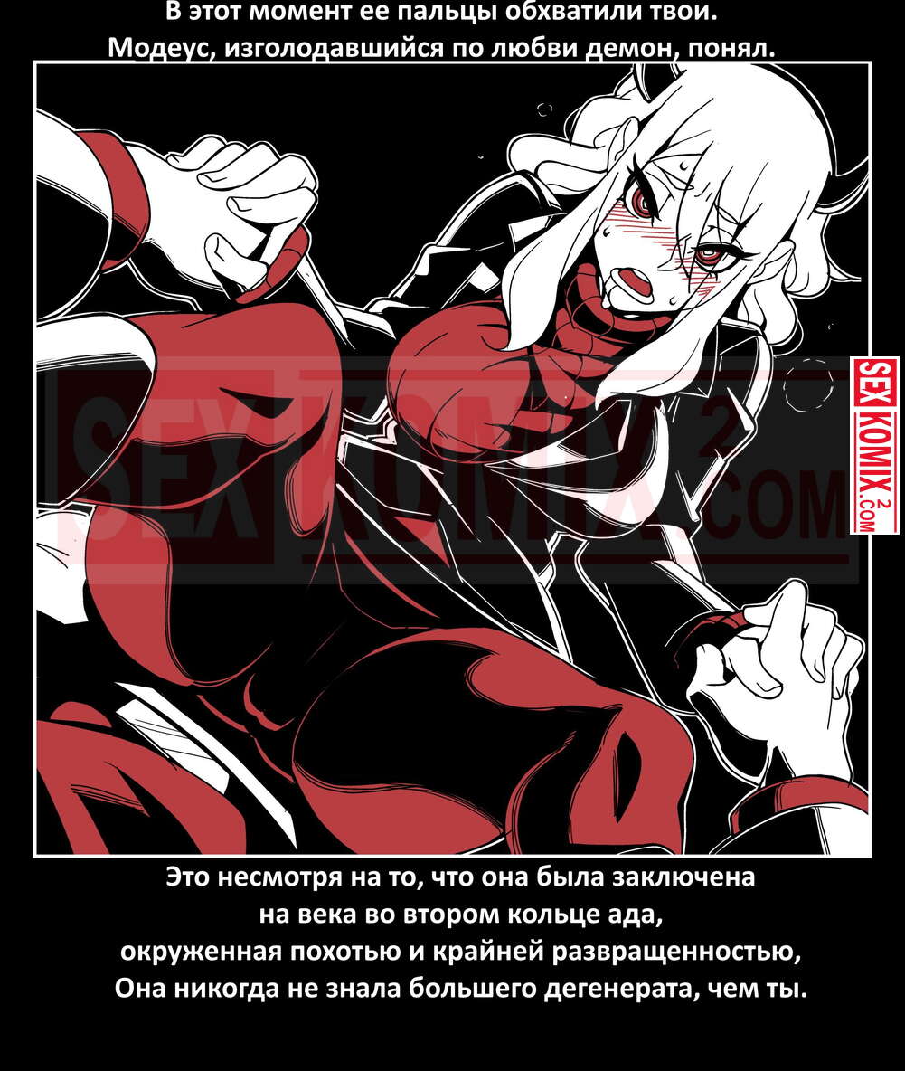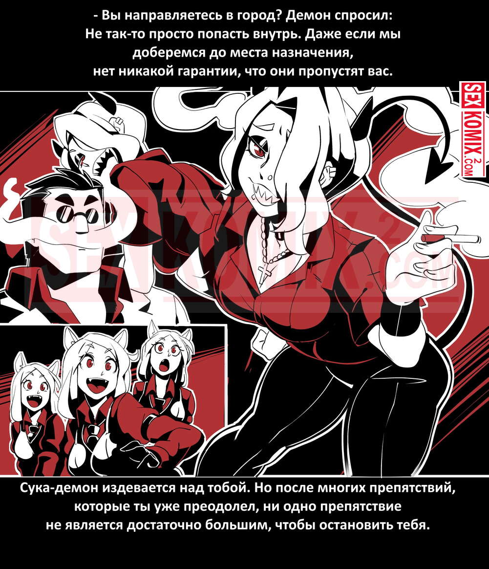 Порно комикс Безумие Хеллтакер. Helltaker. На русском. Мужчина понял, что ему перепадет отличный секс с демоническими красотками и он пошел в дорогу, на встречу опасностям, ради секса. Это похоже на какую-то игры, проходя уровни ты получаешь в награду киску горячей демоницы.