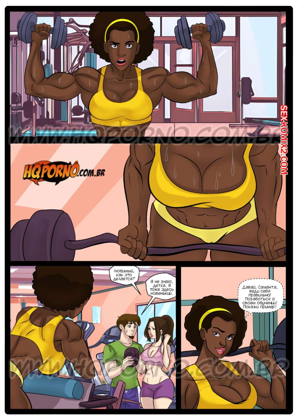 Порно комикс Маромбейрас. Часть 2. Приключение Франго. As marombeirasa. HQPorno Парень с девушкой пришли впервые в спортивный зал и темнокожая красотка решила им помочь. Она соблазнила парочку, после чего они занялись групповой еблей, получив удовольствие.